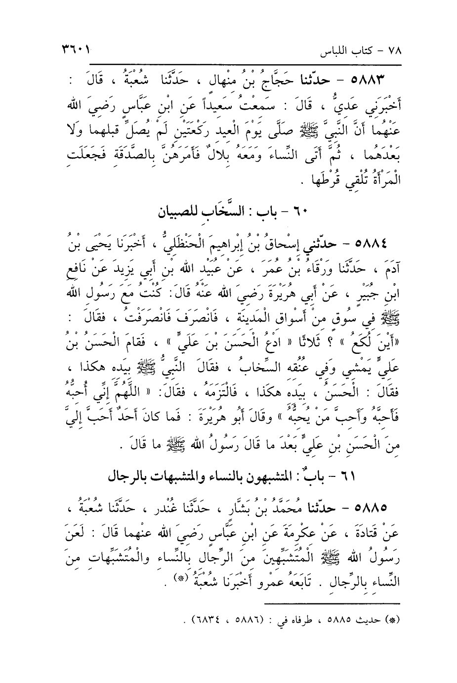 5883 - حَدَّثَنَا حَجَّاجُ بْنُ مِنْهَالٍ، حَدَّثَنَا شُعْبَةُ، قَالَ: أَخْبَرَنِي عَدِيٌّ، قَالَ: سَمِعْتُ سَعِيدًا، عَنِ ابْنِ عَبَّاسٍ، رَضِيَ اللَّهُ عَنْهُمَا، أَنَّ النَّبِيَّ صَلَّى اللهُ عَلَيْهِ وَسَلَّمَ «صَلَّى يَوْمَ العِيدِ رَكْعَتَيْنِ، لَمْ يُصَلِّ قَبْلَهَا وَلاَ بَعْدَهَا، ثُمَّ أَتَى النِّسَاءَ وَمَعَهُ بِلاَلٌ، فَأَمَرَهُنَّ بِالصَّدَقَةِ، فَجَعَلَتِ المَرْأَةُ تُلْقِي قُرْطَهَا».