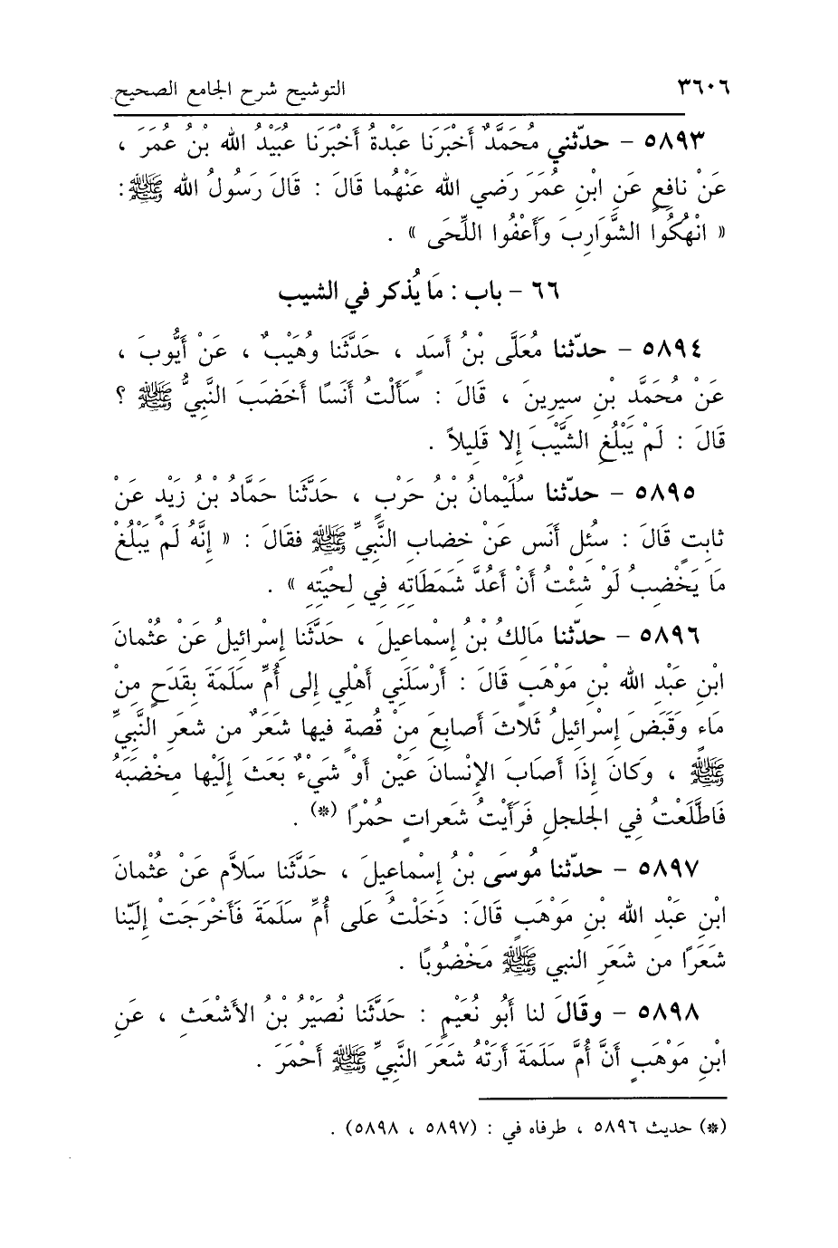 5897 - حَدَّثَنَا مُوسَى بْنُ إِسْمَاعِيلَ، حَدَّثَنَا سَلَّامٌ، عَنْ عُثْمَانَ بْنِ عَبْدِ اللَّهِ بْنِ مَوْهَبٍ، قَالَ: دَخَلْتُ عَلَى أُمِّ سَلَمَةَ، «فَأَخْرَجَتْ إِلَيْنَا شَعَرًا مِنْ شَعَرِ النَّبِيِّ صَلَّى اللهُ عَلَيْهِ وَسَلَّمَ مَخْضُوبًا».