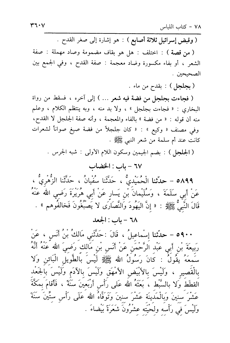 (من قصة): اختلف: هل هو بقاف مضمومة وصاد مهملة: صفة الشعر، أو بفاء مكسورة وضاد معجمة: صفة القدح، وفي الجمع بين الصحيحين.