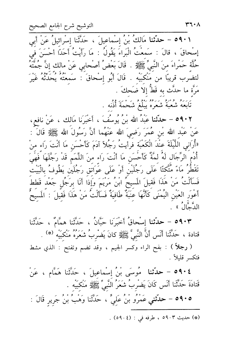 5903 - حَدَّثَنَا إِسْحَاقُ، أَخْبَرَنَا حِبَّانُ، حَدَّثَنَا هَمَّامٌ، حَدَّثَنَا قَتَادَةُ، حَدَّثَنَا أَنَسٌ: «أَنَّ النَّبِيَّ صَلَّى اللهُ عَلَيْهِ وَسَلَّمَ كَانَ يَضْرِبُ شَعَرُهُ مَنْكِبَيْهِ».