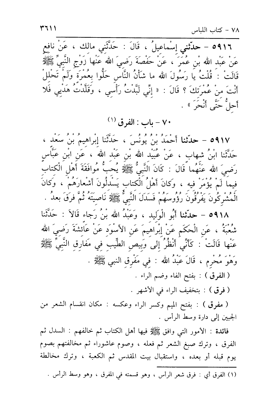 5918 - حَدَّثَنَا أَبُو الوَلِيدِ، وَعَبْدُ اللَّهِ بْنُ رَجَاءٍ، قَالاَ: حَدَّثَنَا شُعْبَةُ، عَنِ الحَكَمِ، عَنْ إِبْرَاهِيمَ، عَنِ الأَسْوَدِ، عَنْ عَائِشَةَ رَضِيَ اللَّهُ عَنْهَا قَالَتْ: «كَأَنِّي أَنْظُرُ إِلَى وَبِيصِ الطِّيبِ فِي مَفَارِقِ النَّبِيِّ صَلَّى اللهُ عَلَيْهِ وَسَلَّمَ وَهُوَ مُحْرِمٌ» قَالَ عَبْدُ اللَّهِ: فِي مَفْرِقِ النَّبِيِّ.