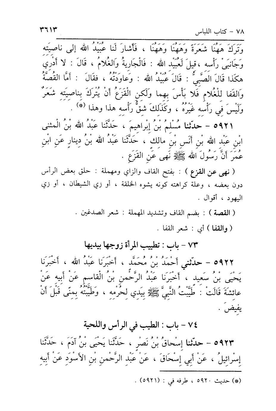 وَتَرَكَ هَا هُنَا شَعَرَةً وَهَا هُنَا وَهَا هُنَا، فَأَشَارَ لَنَا عُبَيْدُ اللَّهِ إِلَى نَاصِيَتِهِ وَجَانِبَيْ رَأْسِهِ. قِيلَ لِعُبَيْدِ اللَّهِ: فَالْجَارِيَةُ وَالغُلاَمُ؟ قَالَ: لاَ أَدْرِي، هَكَذَا قَالَ: الصَّبِيُّ. قَالَ عُبَيْدُ اللَّهِ: وَعَاوَدْتُهُ، فَقَالَ: أَمَّا القُصَّةُ وَالقَفَا لِلْغُلاَمِ فَلاَ بَأْسَ بِهِمَا، وَلَكِنَّ القَزَعَ أَنْ يُتْرَكَ بِنَاصِيَتِهِ شَعَرٌ، وَلَيْسَ فِي رَأْسِهِ غَيْرُهُ، وَكَذَلِكَ شَقُّ رَأْسِهِ هَذَا وَهَذَا.