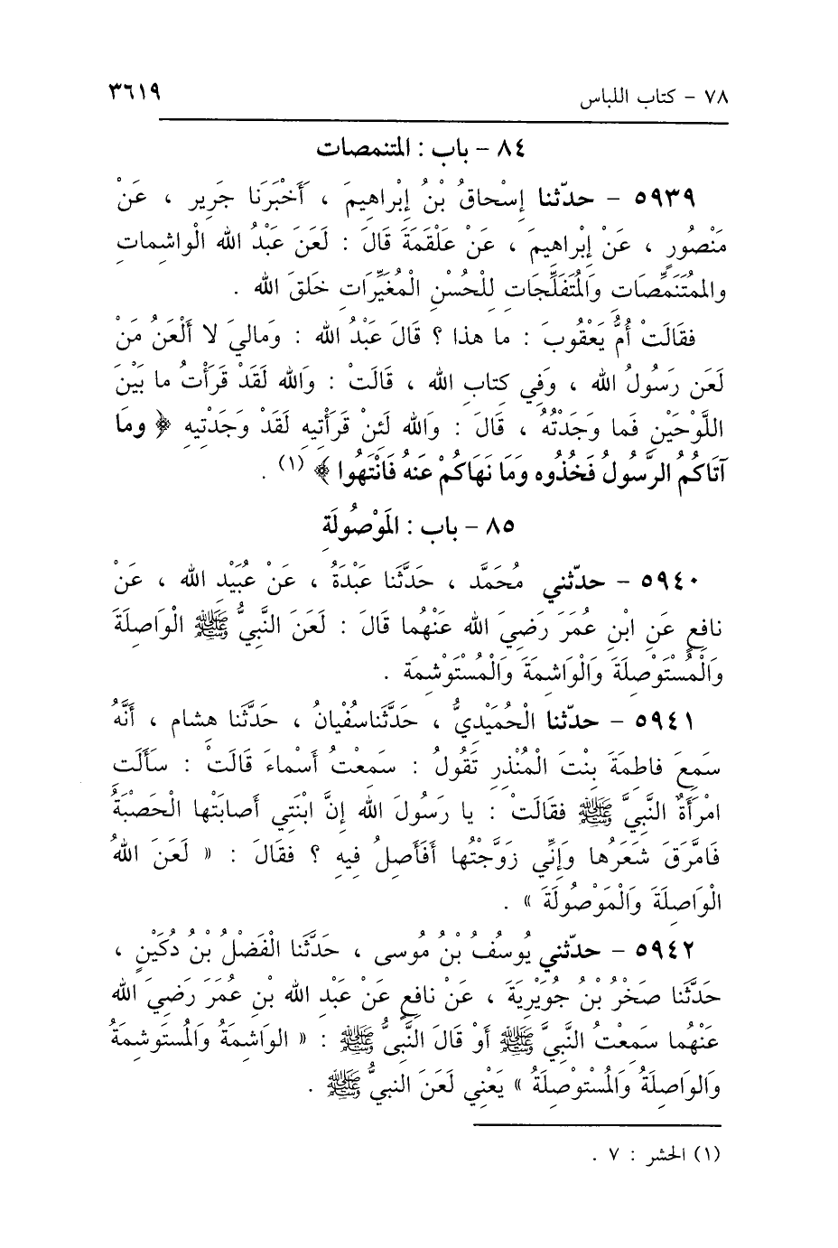 5939 - حَدَّثَنَا إِسْحَاقُ بْنُ إِبْرَاهِيمَ، أَخْبَرَنَا جَرِيرٌ، عَنْ مَنْصُورٍ، عَنْ إِبْرَاهِيمَ، عَنْ عَلْقَمَةَ، قَالَ: «لَعَنَ عَبْدُ اللَّهِ، الوَاشِمَاتِ وَالمُتَنَمِّصَاتِ، وَالمُتَفَلِّجَاتِ لِلْحُسْنِ المُغَيِّرَاتِ خَلْقَ اللَّهِ» فَقَالَتْ أُمُّ يَعْقُوبَ: مَا هَذَا؟ قَالَ عَبْدُ اللَّهِ: «وَمَا لِي لاَ أَلْعَنُ مَنْ لَعَنَ رَسُولُ اللَّهِ، وَفِي كِتَابِ اللَّهِ؟» قَالَتْ: وَاللَّهِ لَقَدْ قَرَأْتُ مَا بَيْنَ اللَّوْحَيْنِ فَمَا وَجَدْتُهُ، قَالَ: " وَاللَّهِ لَئِنْ قَرَأْتِيهِ لَقَدْ وَجَدْتِيهِ: {وَمَا آتَاكُمُ الرَّسُولُ فَخُذُوهُ وَمَا نَهَاكُمْ عَنْهُ فَانْتَهُوا} [الحشر: 7].
