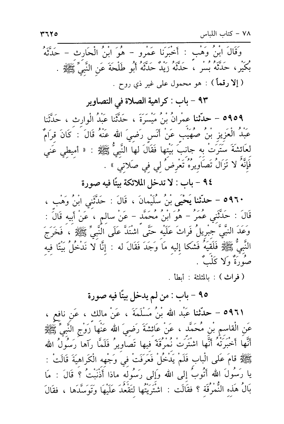5961 - حَدَّثَنَا عَبْدُ اللَّهِ بْنُ مَسْلَمَةَ، عَنْ مَالِكٍ، عَنْ نَافِعٍ، عَنِ القَاسِمِ بْنِ مُحَمَّدٍ، عَنْ عَائِشَةَ، رَضِيَ اللَّهُ عَنْهَا، زَوْجِ النَّبِيِّ صَلَّى اللهُ عَلَيْهِ وَسَلَّمَ أَنَّهَا أَخْبَرَتْهُ: أَنَّهَا اشْتَرَتْ نُمْرُقَةً فِيهَا تَصَاوِيرُ، فَلَمَّا رَآهَا رَسُولُ اللَّهِ صَلَّى اللهُ عَلَيْهِ وَسَلَّمَ قَامَ عَلَى البَابِ فَلَمْ يَدْخُلْ، فَعَرَفَتْ فِي وَجْهِهِ الكَرَاهِيَةَ، قَالَتْ: يَا رَسُولَ اللَّهِ، أَتُوبُ إِلَى اللَّهِ وَإِلَى رَسُولِهِ، مَاذَا أَذْنَبْتُ؟ قَالَ: «مَا بَالُ هَذِهِ النُّمْرُقَةِ» فَقَالَتْ: اشْتَرَيْتُهَا لِتَقْعُدَ عَلَيْهَا وَتَوَسَّدَهَا، فَقَالَ