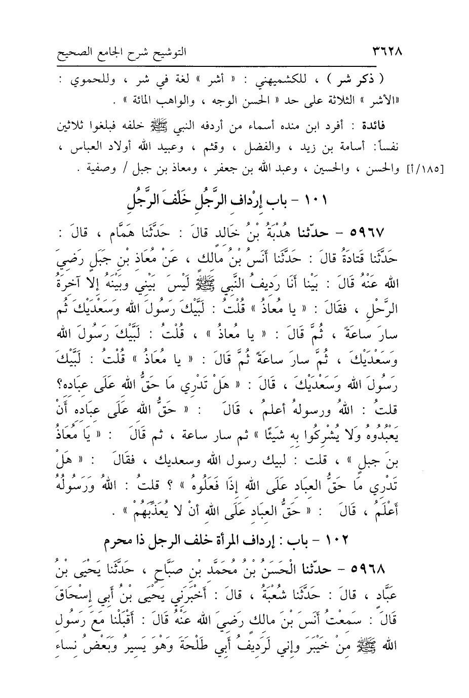 5967 - حَدَّثَنَا هُدْبَةُ بْنُ خَالِدٍ، حَدَّثَنَا هَمَّامٌ، حَدَّثَنَا قَتَادَةُ، حَدَّثَنَا أَنَسُ بْنُ مَالِكٍ، عَنْ مُعَاذِ بْنِ جَبَلٍ رَضِيَ اللَّهُ عَنْهُ قَالَ: بَيْنَا أَنَا رَدِيفُ النَّبِيِّ صَلَّى اللهُ عَلَيْهِ وَسَلَّمَ لَيْسَ بَيْنِي وَبَيْنَهُ إِلَّا أَخِرَةُ الرَّحْلِ، فَقَالَ: «يَا مُعَاذُ بْنَ جَبَلٍ» قُلْتُ: لَبَّيْكَ رَسُولَ اللَّهِ وَسَعْدَيْكَ، ثُمَّ سَارَ سَاعَةً ثُمَّ قَالَ: «يَا مُعَاذُ» قُلْتُ: لَبَّيْكَ رَسُولَ اللَّهِ وَسَعْدَيْكَ، ثُمَّ سَارَ سَاعَةً ثُمَّ قَالَ: «يَا مُعَاذُ» قُلْتُ: لَبَّيْكَ رَسُولَ اللَّهِ وَسَعْدَيْكَ، قَالَ: «هَلْ تَدْرِي مَا حَقُّ اللَّهِ عَلَى عِبَادِهِ» قُلْتُ: اللَّهُ وَرَسُولُهُ أَعْلَمُ، قَالَ: «حَقُّ اللَّهِ عَلَى عِبَادِهِ أَنْ يَعْبُدُوهُ، وَلاَ يُشْرِكُوا بِهِ شَيْئًا» ثُمَّ سَارَ سَاعَةً، ثُمَّ قَالَ: «يَا مُعَاذُ بْنَ جَبَلٍ» قُلْتُ: لَبَّيْكَ رَسُولَ اللَّهِ وَسَعْدَيْكَ، فَقَالَ: «هَلْ تَدْرِي مَا حَقُّ العِبَادِ عَلَى اللَّهِ إِذَا فَعَلُوهُ» قُلْتُ: اللَّهُ وَرَسُولُهُ أَعْلَمُ، قَالَ: «حَقُّ العِبَادِ عَلَى اللَّهِ أَنْ لاَ يُعَذِّبَهُمْ».