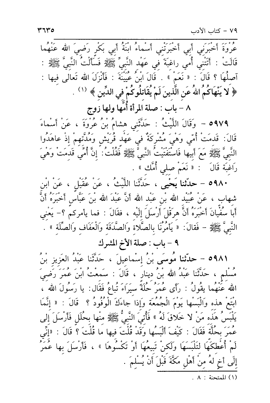 عُرْوَةَ، أَخْبَرَنِي أَبِي، أَخْبَرَتْنِي أَسْمَاءُ بِنْتُ أَبِي بَكْرٍ، رَضِيَ اللَّهُ عَنْهُمَا قَالَتْ: أَتَتْنِي أُمِّي رَاغِبَةً، فِي عَهْدِ النَّبِيِّ صَلَّى اللهُ عَلَيْهِ وَسَلَّمَ، فَسَأَلْتُ النَّبِيَّ صَلَّى اللهُ عَلَيْهِ وَسَلَّمَ: آصِلُهَا؟ قَالَ: «نَعَمْ» قَالَ ابْنُ عُيَيْنَةَ: فَأَنْزَلَ اللَّهُ تَعَالَى فِيهَا: {لاَ يَنْهَاكُمُ اللَّهُ عَنِ الَّذِينَ لَمْ يُقَاتِلُوكُمْ فِي الدِّينِ} [الممتحنة: 8].