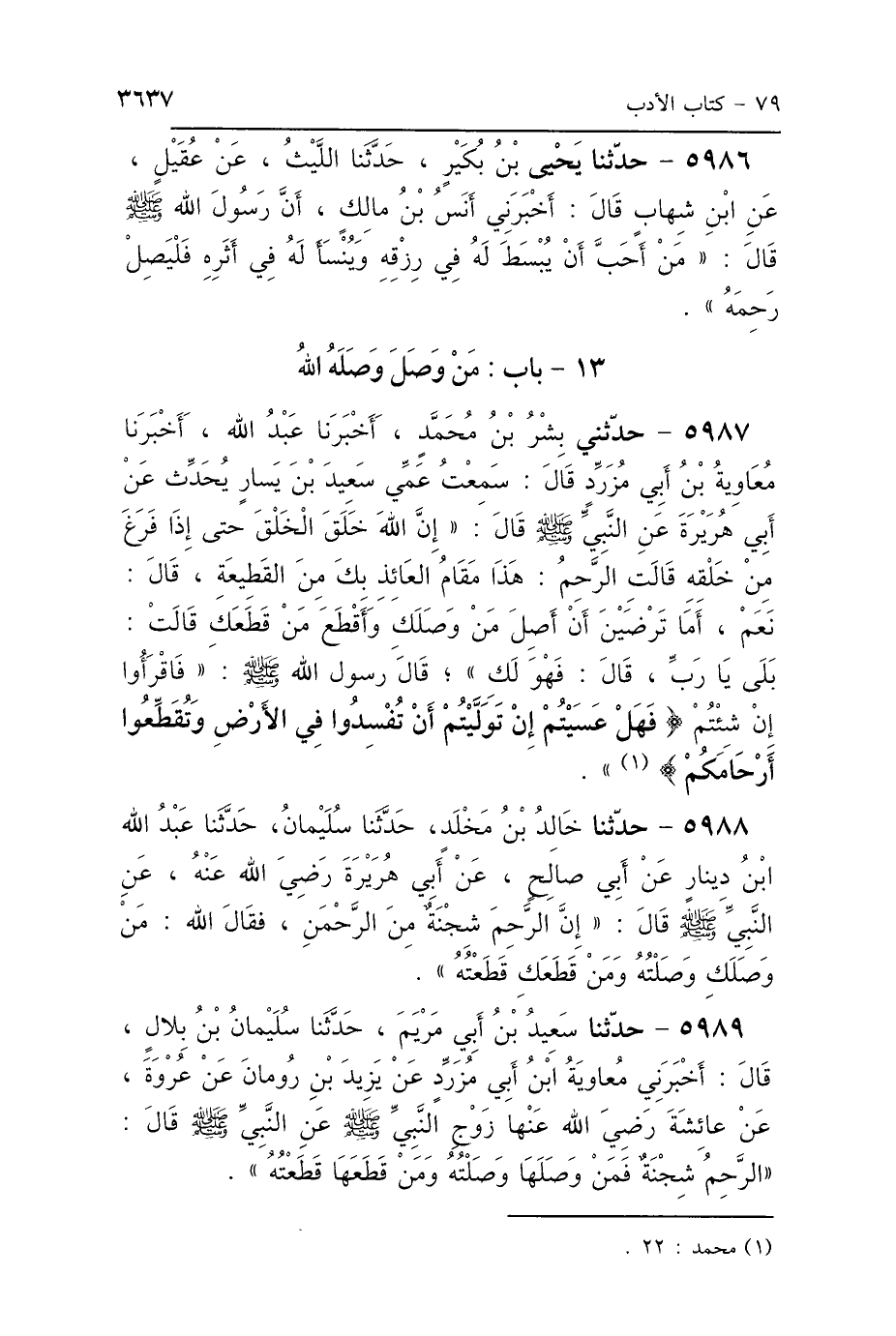 5987 - حَدَّثَنِي بِشْرُ بْنُ مُحَمَّدٍ، أَخْبَرَنَا عَبْدُ اللَّهِ، أَخْبَرَنَا مُعَاوِيَةُ بْنُ أَبِي مُزَرِّدٍ، قَالَ: سَمِعْتُ عَمِّي سَعِيدَ بْنَ يَسَارٍ، يُحَدِّثُ، عَنْ أَبِي هُرَيْرَةَ، عَنِ النَّبِيِّ صَلَّى اللهُ عَلَيْهِ وَسَلَّمَ قَالَ: " إِنَّ اللَّهَ خَلَقَ الخَلْقَ، حَتَّى إِذَا فَرَغَ مِنْ خَلْقِهِ، قَالَتِ الرَّحِمُ: هَذَا مَقَامُ العَائِذِ بِكَ مِنَ القَطِيعَةِ، قَالَ: نَعَمْ، أَمَا تَرْضَيْنَ أَنْ أَصِلَ مَنْ وَصَلَكِ، وَأَقْطَعَ مَنْ قَطَعَكِ؟ قَالَتْ: بَلَى يَا رَبِّ، قَالَ: فَهُوَ لَكِ " قَالَ رَسُولُ اللَّهِ صَلَّى اللهُ عَلَيْهِ وَسَلَّمَ: "فَاقْرَءُوا إِنْ شِئْتُمْ: {فَهَلْ عَسَيْتُمْ إِنْ تَوَلَّيْتُمْ أَنْ تُفْسِدُوا فِي الأَرْضِ وَتُقَطِّعُوا أَرْحَامَكُمْ} [محمد: 22] ".