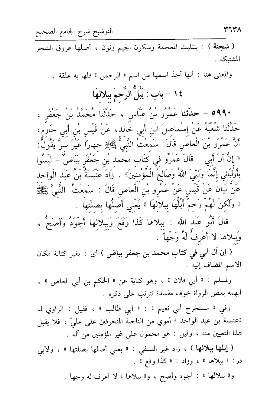 5990 - حَدَّثَنَا عَمْرُو بْنُ عَبَّاسٍ، حَدَّثَنَا مُحَمَّدُ بْنُ جَعْفَرٍ، حَدَّثَنَا شُعْبَةُ، عَنْ إِسْمَاعِيلَ بْنِ أَبِي خَالِدٍ، عَنْ قَيْسِ بْنِ أَبِي حَازِمٍ، أَنَّ عَمْرَو بْنَ العَاصِ، قَالَ: سَمِعْتُ النَّبِيَّ صَلَّى اللهُ عَلَيْهِ وَسَلَّمَ جِهَارًا غَيْرَ سِرٍّ يَقُولُ: " إِنَّ آلَ أَبِي - قَالَ عَمْرٌو: فِي كِتَابِ مُحَمَّدِ بْنِ جَعْفَرٍ بَيَاضٌ - لَيْسُوا بِأَوْلِيَائِي، إِنَّمَا وَلِيِّيَ اللَّهُ وَصَالِحُ المُؤْمِنِينَ " زَادَ عَنْبَسَةُ بْنُ عَبْدِ الوَاحِدِ، عَنْ بَيَانٍ، عَنْ قَيْسٍ، عَنْ عَمْرِو بْنِ العَاصِ، قَالَ: سَمِعْتُ النَّبِيَّ صَلَّى اللهُ عَلَيْهِ وَسَلَّمَ: «وَلَكِنْ لَهُمْ رَحِمٌ أَبُلُّهَا بِبَلاَهَا» يَعْنِي أَصِلُهَا بِصِلَتِهَا قَالَ أَبُو عَبْدِ اللَّهِ: «بِبَلاَهَا كَذَا وَقَعَ، وَبِبَلاَلِهَا أَجْوَدُ وَأَصَحُّ، وَبِبَلاَهَا لاَ أَعْرِفُ لَهُ وَجْهًا».