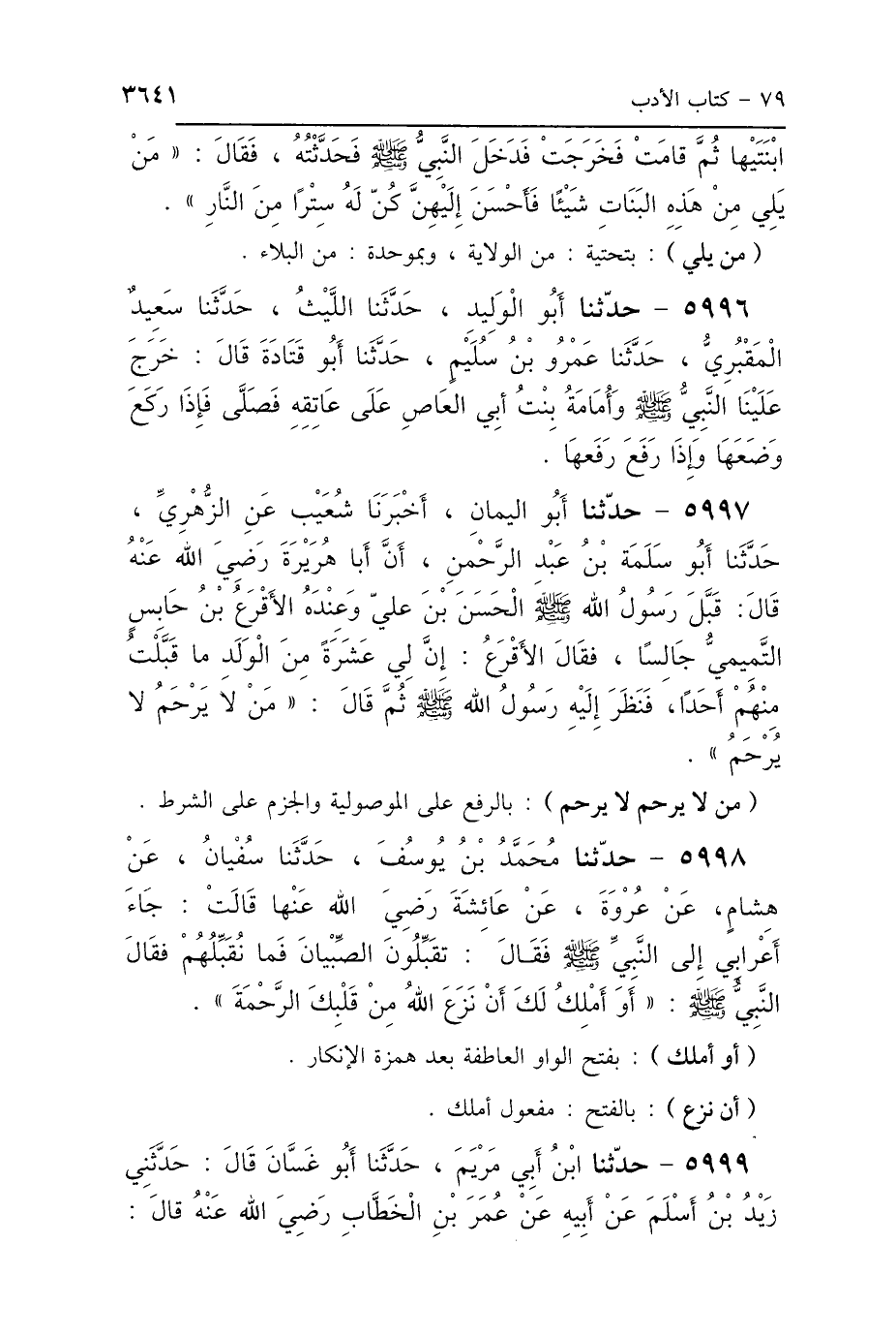 5997 - حَدَّثَنَا أَبُو اليَمَانِ، أَخْبَرَنَا شُعَيْبٌ، عَنِ الزُّهْرِيِّ، حَدَّثَنَا أَبُو سَلَمَةَ بْنُ عَبْدِ الرَّحْمَنِ، أَنَّ أَبَا هُرَيْرَةَ رَضِيَ اللَّهُ عَنْهُ قَالَ: قَبَّلَ رَسُولُ اللَّهِ صَلَّى اللهُ عَلَيْهِ وَسَلَّمَ الحَسَنَ بْنَ عَلِيٍّ وَعِنْدَهُ الأَقْرَعُ بْنُ حَابِسٍ التَّمِيمِيُّ جَالِسًا، فَقَالَ الأَقْرَعُ: إِنَّ لِي عَشَرَةً مِنَ الوَلَدِ مَا قَبَّلْتُ مِنْهُمْ أَحَدًا، فَنَظَرَ إِلَيْهِ رَسُولُ اللَّهِ صَلَّى اللهُ عَلَيْهِ وَسَلَّمَ ثُمَّ قَالَ: «مَنْ لاَ يَرْحَمُ لاَ يُرْحَمُ».
