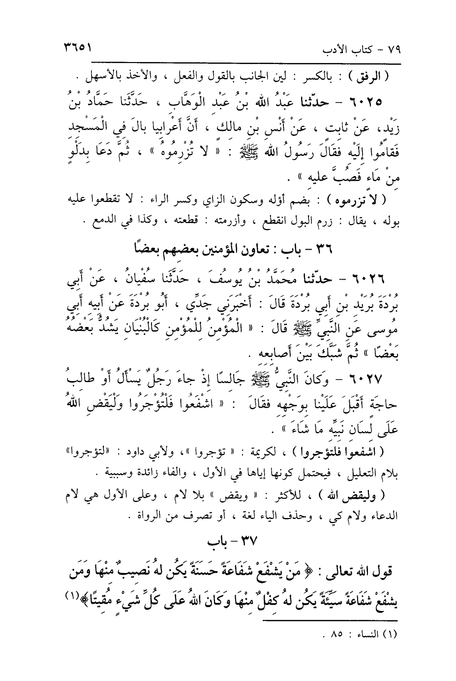 37 - باب بَابُ قَوْلِ اللَّهِ تَعَالَى: {مَنْ يَشْفَعْ شَفَاعَةً حَسَنَةً يَكُنْ لَهُ نَصِيبٌ مِنْهَا، وَمَنْ يَشْفَعْ شَفَاعَةً سَيِّئَةً يَكُنْ لَهُ كِفْلٌ مِنْهَا، وَكَانَ اللَّهُ عَلَى كُلِّ شَيْءٍ مُقِيتًا} [النساء: 85]