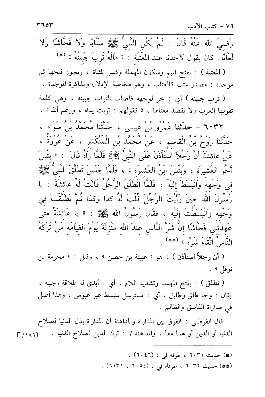 6032 - حَدَّثَنَا عَمْرُو بْنُ عِيسَى، حَدَّثَنَا مُحَمَّدُ بْنُ سَوَاءٍ، حَدَّثَنَا رَوْحُ بْنُ القَاسِمِ، عَنْ مُحَمَّدِ بْنِ المُنْكَدِرِ، عَنْ عُرْوَةَ، عَنْ عَائِشَةَ: أَنَّ رَجُلًا اسْتَأْذَنَ عَلَى النَّبِيِّ صَلَّى اللهُ عَلَيْهِ وَسَلَّمَ، فَلَمَّا رَآهُ قَالَ: «بِئْسَ أَخُو العَشِيرَةِ، وَبِئْسَ ابْنُ العَشِيرَةِ» فَلَمَّا جَلَسَ تَطَلَّقَ النَّبِيُّ صَلَّى اللهُ عَلَيْهِ وَسَلَّمَ فِي وَجْهِهِ وَانْبَسَطَ إِلَيْهِ، فَلَمَّا انْطَلَقَ الرَّجُلُ قَالَتْ لَهُ عَائِشَةُ: يَا رَسُولَ اللَّهِ، حِينَ رَأَيْتَ الرَّجُلَ قُلْتَ لَهُ كَذَا وَكَذَا، ثُمَّ تَطَلَّقْتَ فِي وَجْهِهِ وَانْبَسَطْتَ إِلَيْهِ؟ فَقَالَ رَسُولُ اللَّهِ صَلَّى اللهُ عَلَيْهِ وَسَلَّمَ: «يَا عَائِشَةُ، مَتَى عَهِدْتِنِي فَحَّاشًا، إِنَّ شَرَّ النَّاسِ عِنْدَ اللَّهِ مَنْزِلَةً يَوْمَ القِيَامَةِ مَنْ تَرَكَهُ النَّاسُ اتِّقَاءَ شَرِّهِ».