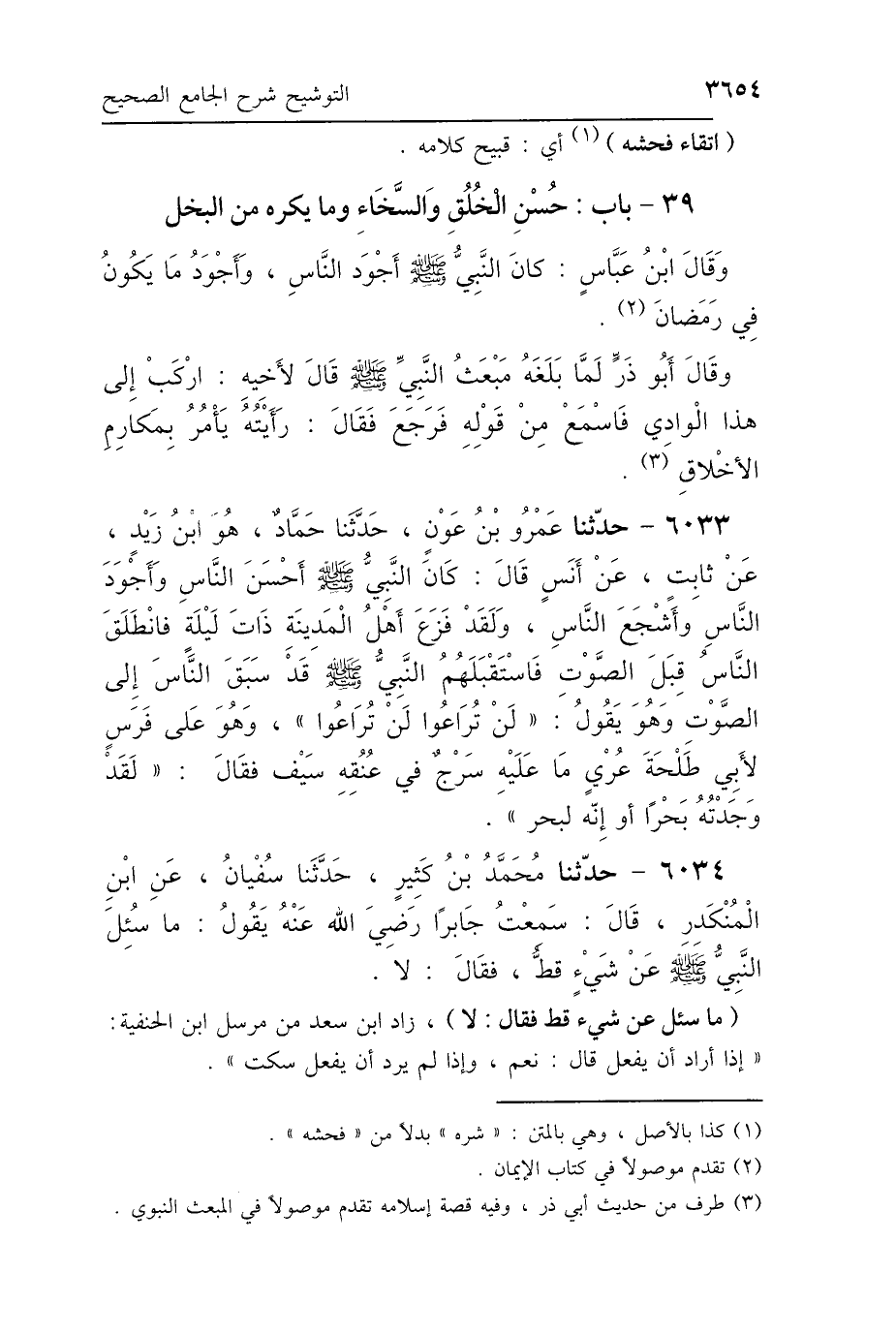 6034 - حَدَّثَنَا مُحَمَّدُ بْنُ كَثِيرٍ، أَخْبَرَنَا سُفْيَانُ، عَنِ ابْنِ المُنْكَدِرِ، قَالَ: سَمِعْتُ جَابِرًا رَضِيَ اللَّهُ عَنْهُ، يَقُولُ: "مَا سُئِلَ النَّبِيُّ صَلَّى اللهُ عَلَيْهِ وَسَلَّمَ عَنْ شَيْءٍ قَطُّ فَقَالَ: لاَ".