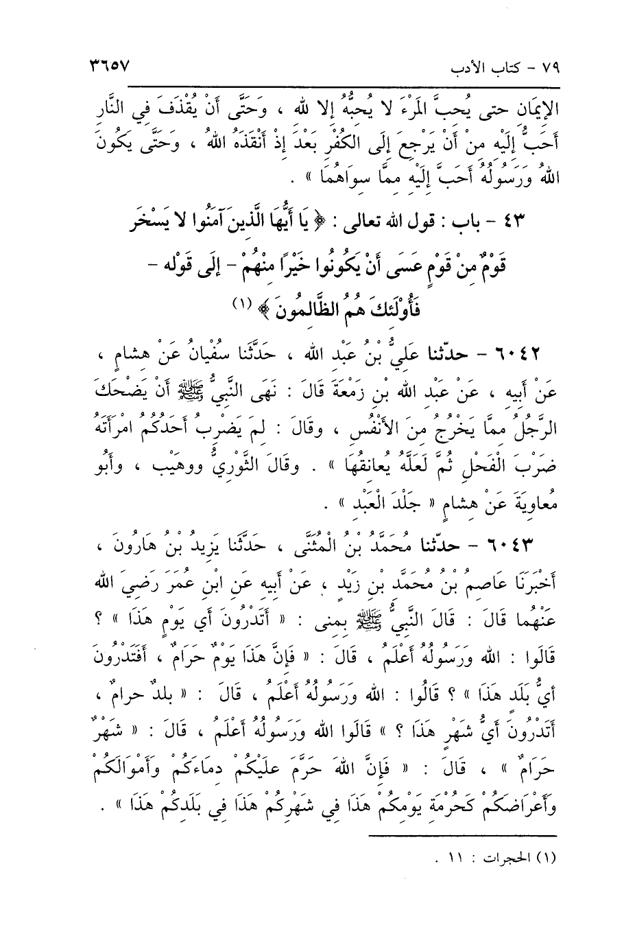 43 - بَابُ قَوْلِ اللَّهِ تَعَالَى: {يَا أَيُّهَا الَّذِينَ آمَنُوا لاَ يَسْخَرْ قَوْمٌ مِنْ قَوْمٍ عَسَى أَنْ يَكُونُوا خَيْرًا مِنْهُمْ} [الحجرات: 11]- إِلَى قَوْلِهِ - {فَأُولَئِكَ هُمُ الظَّالِمُونَ} [البقرة: 229]