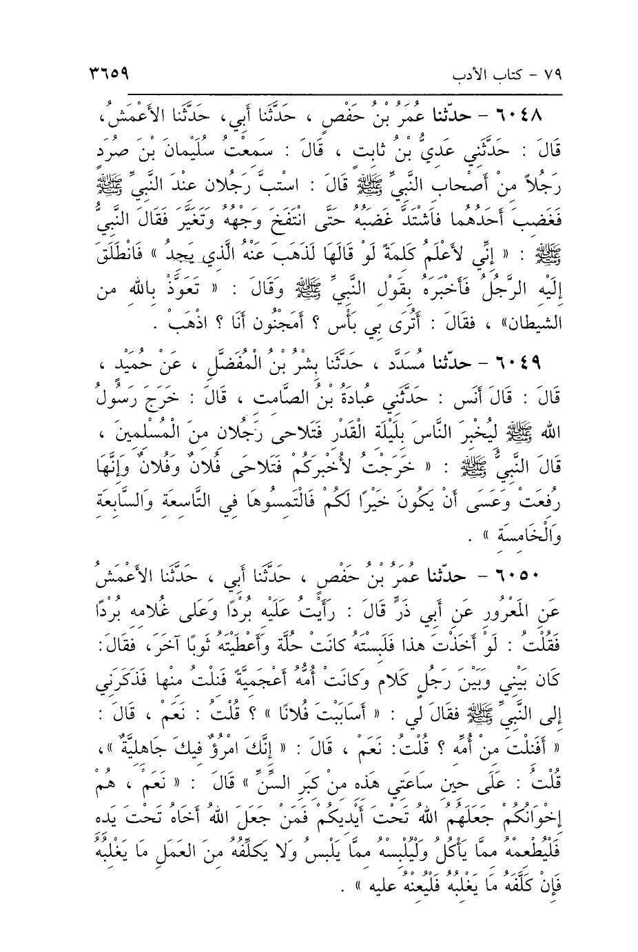 6048 - حَدَّثَنَا عُمَرُ بْنُ حَفْصٍ، حَدَّثَنَا أَبِي، حَدَّثَنَا الأَعْمَشُ، قَالَ: حَدَّثَنِي عَدِيُّ بْنُ ثَابِتٍ، قَالَ: سَمِعْتُ سُلَيْمَانَ بْنَ صُرَدٍ، رَجُلًا مِنْ أَصْحَابِ النَّبِيِّ صَلَّى اللهُ عَلَيْهِ وَسَلَّمَ [ص:16] قَالَ: اسْتَبَّ رَجُلاَنِ عِنْدَ النَّبِيِّ صَلَّى اللهُ عَلَيْهِ وَسَلَّمَ، فَغَضِبَ أَحَدُهُمَا، فَاشْتَدَّ غَضَبُهُ حَتَّى انْتَفَخَ وَجْهُهُ وَتَغَيَّرَ: فَقَالَ النَّبِيُّ صَلَّى اللهُ عَلَيْهِ وَسَلَّمَ: «إِنِّي لَأَعْلَمُ كَلِمَةً، لَوْ قَالَهَا لَذَهَبَ عَنْهُ الَّذِي يَجِدُ» فَانْطَلَقَ إِلَيْهِ الرَّجُلُ فَأَخْبَرَهُ بِقَوْلِ النَّبِيِّ صَلَّى اللهُ عَلَيْهِ وَسَلَّمَ وَقَالَ: «تَعَوَّذْ بِاللَّهِ مِنَ الشَّيْطَانِ» فَقَالَ: أَتُرَى بِي بَأْسٌ، أَمَجْنُونٌ أَنَا، اذْهَبْ.