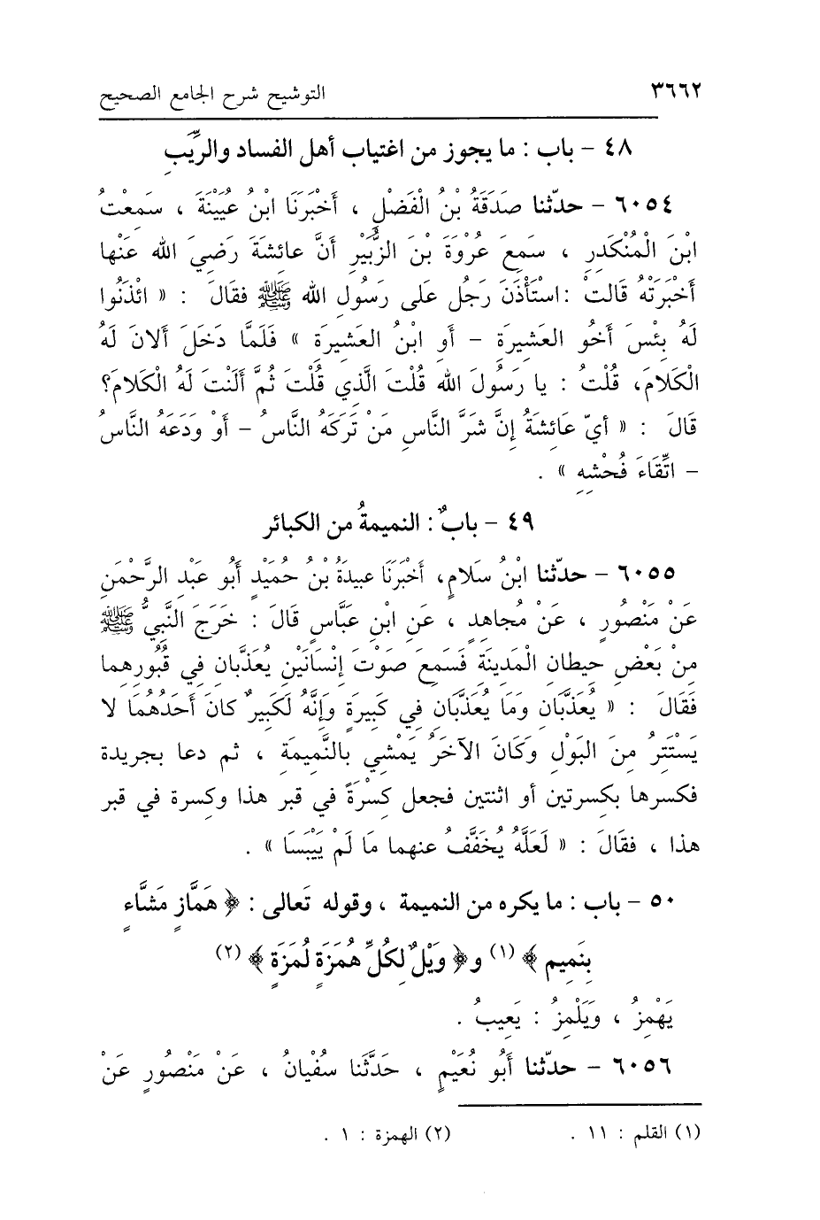 50 - بَابُ مَا يُكْرَهُ مِنَ النَّمِيمَةِ، وَقَوْلِهِ: {هَمَّازٍ مَشَّاءٍ بِنَمِيمٍ} [القلم: 11] {وَيْلٌ لِكُلِّ هُمَزَةٍ لُمَزَةٍ} [الهمزة: 1]