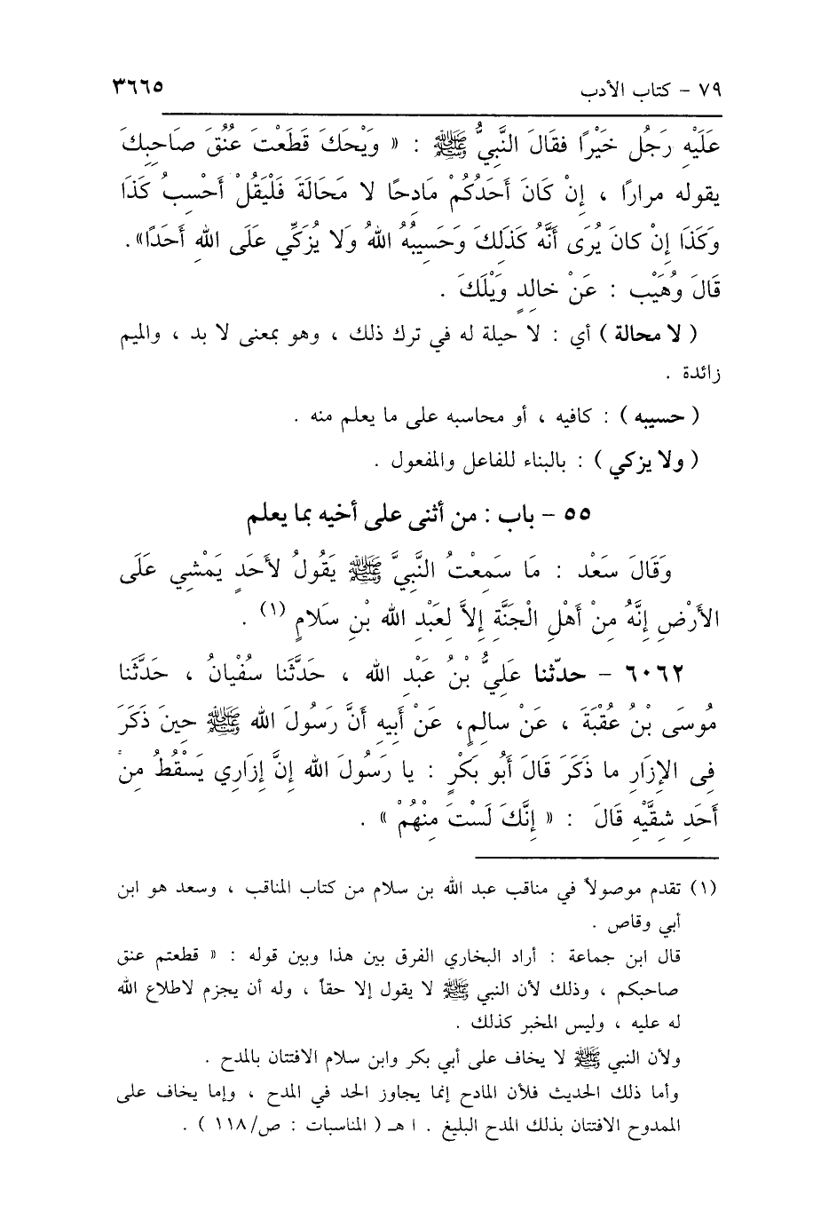 عَلَيْهِ رَجُلٌ خَيْرًا، فَقَالَ النَّبِيُّ صَلَّى اللهُ عَلَيْهِ وَسَلَّمَ: "وَيْحَكَ، قَطَعْتَ عُنُقَ صَاحِبِكَ - يَقُولُهُ مِرَارًا - إِنْ كَانَ أَحَدُكُمْ مَادِحًا لاَ مَحَالَةَ فَلْيَقُلْ: أَحْسِبُ كَذَا وَكَذَا، إِنْ كَانَ يُرَى أَنَّهُ كَذَلِكَ، وَحَسِيبُهُ اللَّهُ، وَلاَ يُزَكِّي عَلَى اللَّهِ أَحَدًا". قَالَ وُهَيْبٌ، عَنْ خَالِدٍ: «وَيْلَكَ».