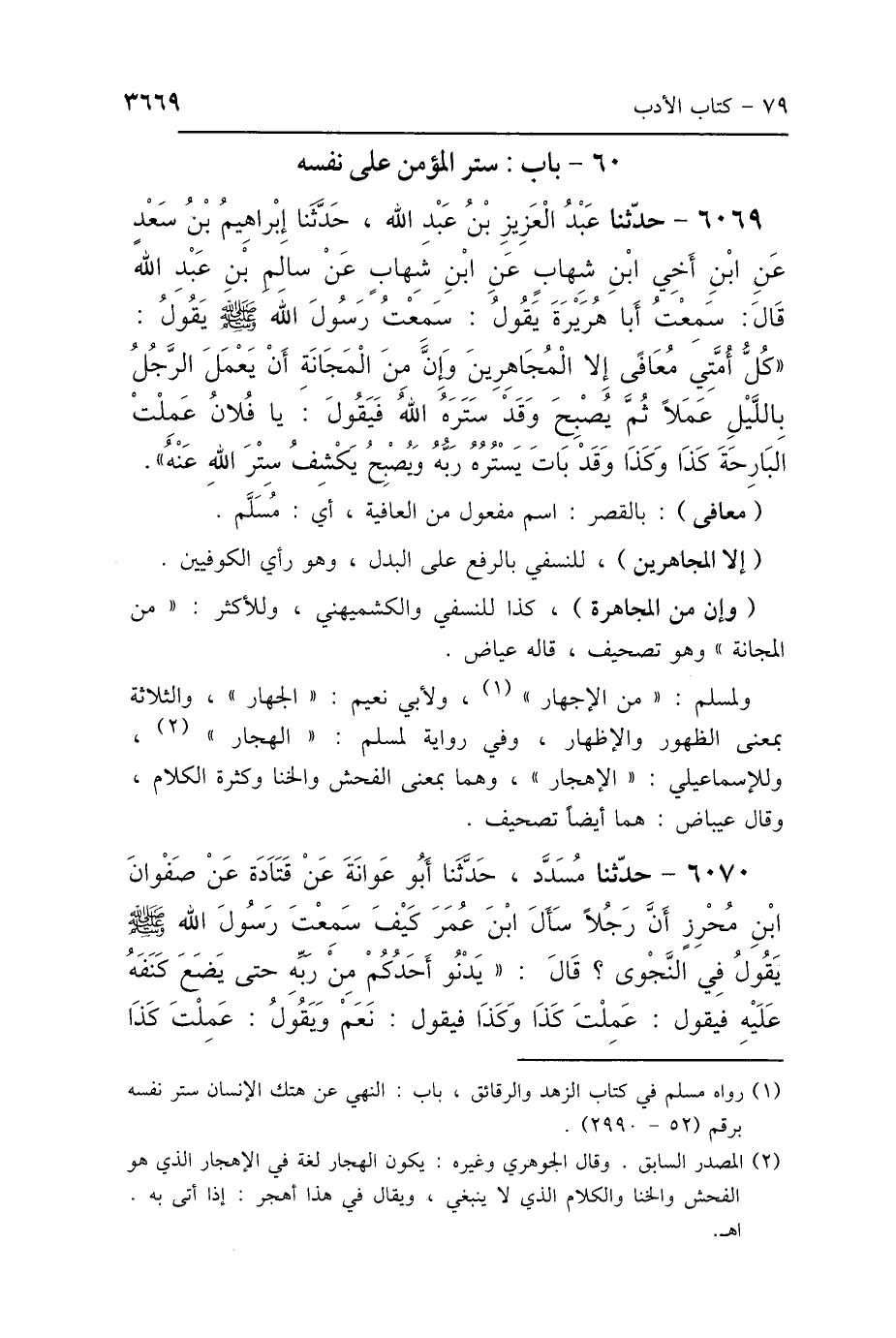 6069 - حَدَّثَنَا عَبْدُ العَزِيزِ بْنُ عَبْدِ اللَّهِ، حَدَّثَنَا إِبْرَاهِيمُ بْنُ سَعْدٍ، عَنِ ابْنِ أَخِي ابْنِ شِهَابٍ، عَنِ ابْنِ شِهَابٍ، عَنْ سَالِمِ بْنِ عَبْدِ اللَّهِ، قَالَ: سَمِعْتُ أَبَا هُرَيْرَةَ، يَقُولُ: سَمِعْتُ رَسُولَ اللَّهِ صَلَّى اللهُ عَلَيْهِ وَسَلَّمَ يَقُولُ: " كُلُّ أُمَّتِي مُعَافًى إِلَّا المُجَاهِرِينَ، وَإِنَّ مِنَ المُجَاهَرَةِ أَنْ يَعْمَلَ الرَّجُلُ بِاللَّيْلِ عَمَلًا، ثُمَّ يُصْبِحَ وَقَدْ سَتَرَهُ اللَّهُ عَلَيْهِ، فَيَقُولَ: يَا فُلاَنُ، عَمِلْتُ البَارِحَةَ كَذَا وَكَذَا، وَقَدْ بَاتَ يَسْتُرُهُ رَبُّهُ، وَيُصْبِحُ يَكْشِفُ سِتْرَ اللَّهِ عَنْهُ".