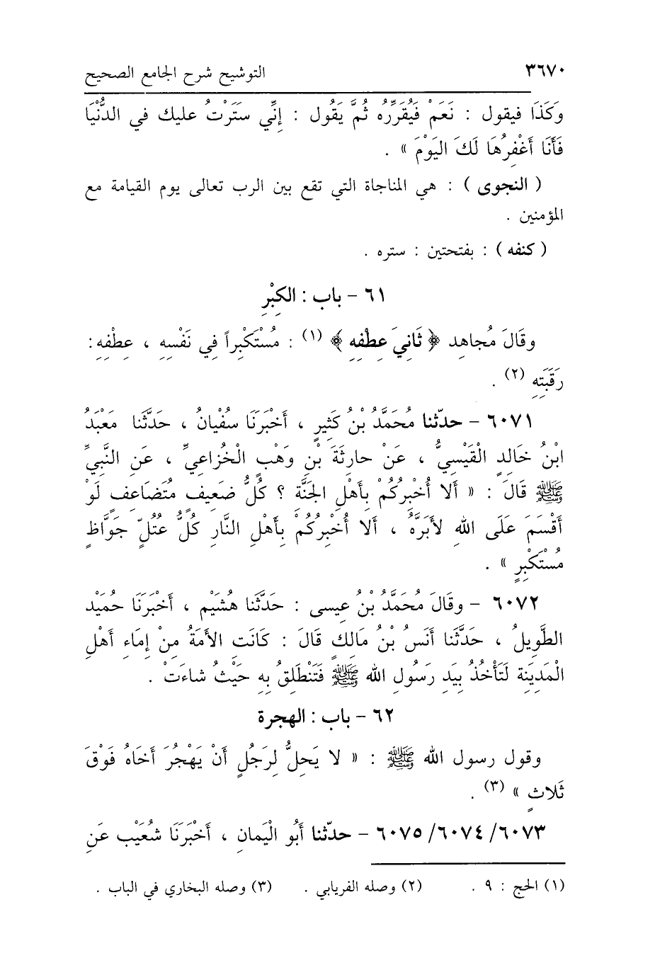 وَقَالَ مُجَاهِدٌ: {ثَانِيَ عِطْفِهِ} [الحج: 9]: "مُسْتَكْبِرٌ فِي نَفْسِهِ، عِطْفُهُ: رَقَبَتُهُ".