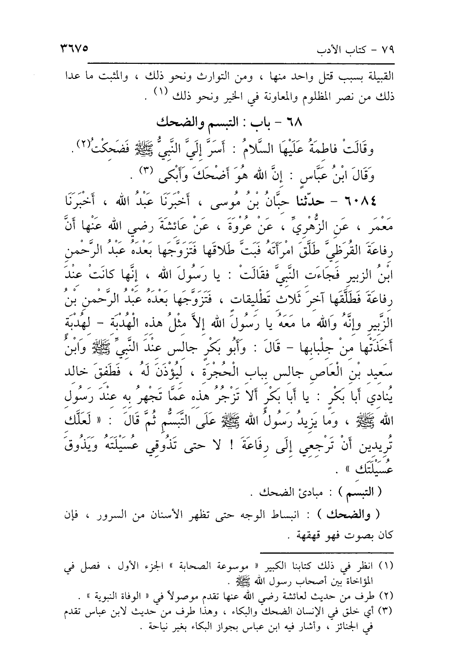 وَقَالَتْ فَاطِمَةُ عَلَيْهَا السَّلاَمُ: «أَسَرَّ إِلَيَّ النَّبِيُّ صَلَّى اللهُ عَلَيْهِ وَسَلَّمَ فَضَحِكْتُ» وَقَالَ ابْنُ عَبَّاسٍ: «إِنَّ اللَّهَ هُوَ أَضْحَكَ وَأَبْكَى».