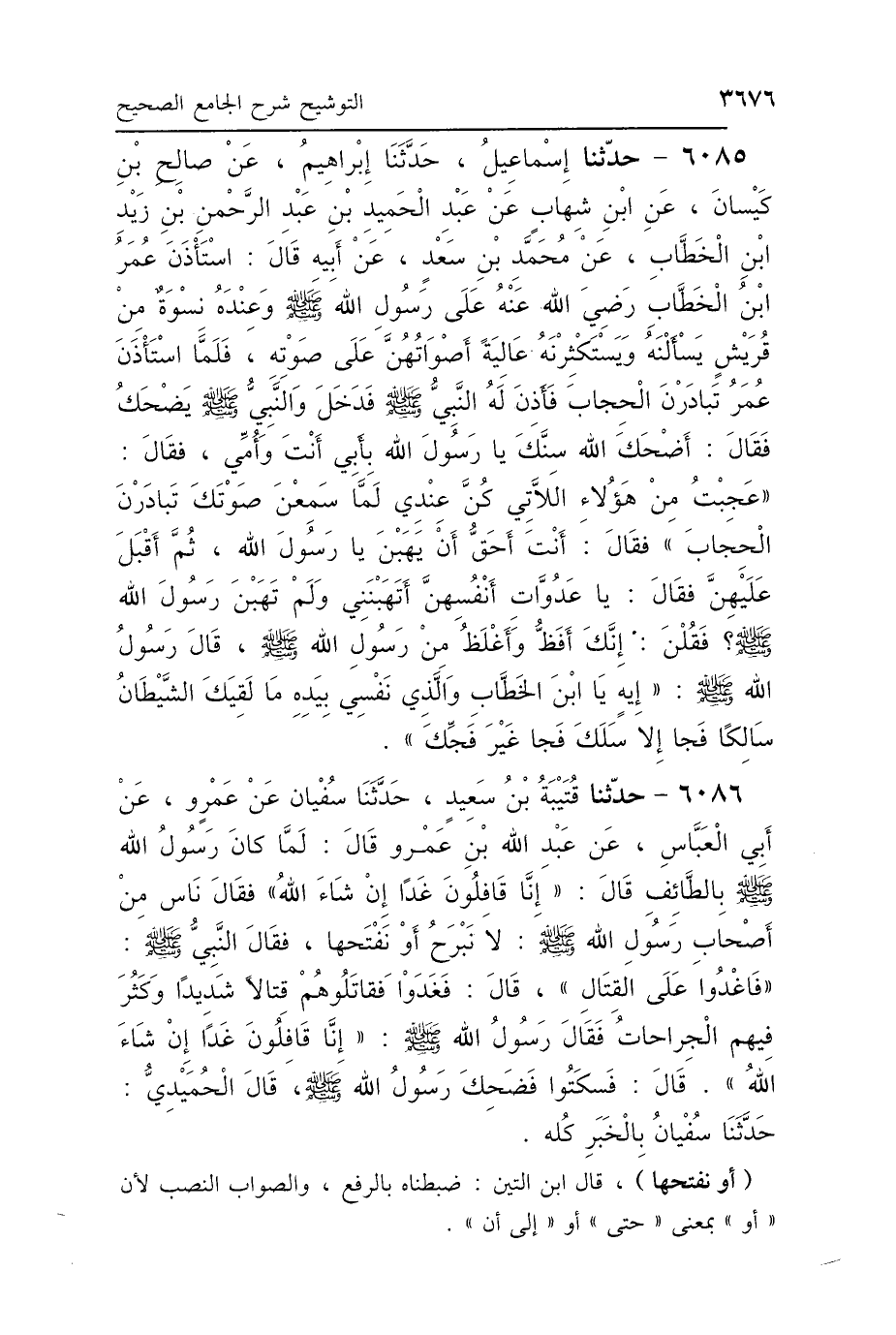 6085 - حَدَّثَنَا إِسْمَاعِيلُ، حَدَّثَنَا إِبْرَاهِيمُ، عَنْ صَالِحِ بْنِ كَيْسَانَ، عَنِ ابْنِ شِهَابٍ، عَنْ عَبْدِ الحَمِيدِ بْنِ عَبْدِ الرَّحْمَنِ بْنِ زَيْدِ بْنِ الخَطَّابِ، عَنْ مُحَمَّدِ بْنِ سَعْدٍ، عَنْ أَبِيهِ، قَالَ: اسْتَأْذَنَ عُمَرُ بْنُ الخَطَّابِ رَضِيَ اللَّهُ عَنْهُ عَلَى رَسُولِ اللَّهِ صَلَّى اللهُ عَلَيْهِ وَسَلَّمَ، وَعِنْدَهُ نِسْوَةٌ مِنْ قُرَيْشٍ يَسْأَلْنَهُ وَيَسْتَكْثِرْنَهُ، عَالِيَةً أَصْوَاتُهُنَّ عَلَى صَوْتِهِ، فَلَمَّا اسْتَأْذَنَ عُمَرُ تَبَادَرْنَ الحِجَابَ، فَأَذِنَ لَهُ النَّبِيُّ صَلَّى اللهُ عَلَيْهِ وَسَلَّمَ فَدَخَلَ وَالنَّبِيُّ صَلَّى اللهُ عَلَيْهِ وَسَلَّمَ يَضْحَكُ، فَقَالَ: أَضْحَكَ اللَّهُ سِنَّكَ يَا رَسُولَ اللَّهِ، بِأَبِي أَنْتَ وَأُمِّي؟ فَقَالَ: «عَجِبْتُ مِنْ هَؤُلاَءِ اللَّاتِي كُنَّ عِنْدِي، لَمَّا سَمِعْنَ صَوْتَكَ تَبَادَرْنَ الحِجَابَ» فَقَالَ: أَنْتَ أَحَقُّ أَنْ يَهَبْنَ يَا رَسُولَ اللَّهِ، ثُمَّ أَقْبَلَ عَلَيْهِنَّ، فَقَالَ: يَا عَدُوَّاتِ أَنْفُسِهِنَّ، أَتَهَبْنَنِي وَلَمْ تَهَبْنَ رَسُولَ اللَّهِ صَلَّى اللهُ عَلَيْهِ وَسَلَّمَ؟ فَقُلْنَ: إِنَّكَ أَفَظُّ وَأَغْلَظُ مِنْ رَسُولِ اللَّهِ صَلَّى اللهُ عَلَيْهِ وَسَلَّمَ، قَالَ رَسُولُ اللَّهِ صَلَّى اللهُ عَلَيْهِ وَسَلَّمَ: «إِيهٍ يَا ابْنَ الخَطَّابِ، وَالَّذِي نَفْسِي بِيَدِهِ، مَا لَقِيَكَ الشَّيْطَانُ سَالِكًا فَجًّا إِلَّا سَلَكَ فَجًّا غَيْرَ فَجِّكَ».