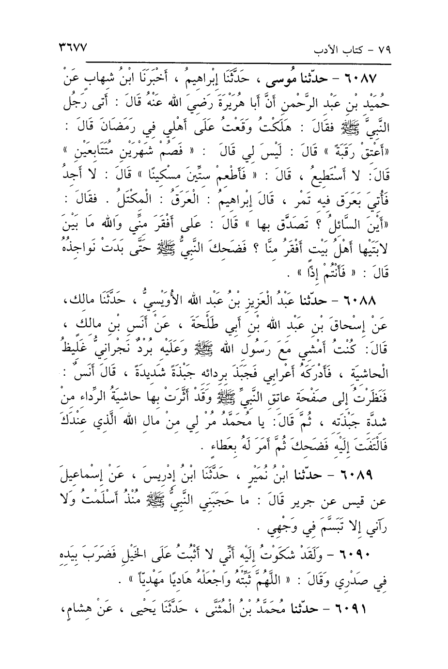 6088 - حَدَّثَنَا عَبْدُ العَزِيزِ بْنُ عَبْدِ اللَّهِ الأُوَيْسِيُّ، حَدَّثَنَا مَالِكٌ، عَنْ إِسْحَاقَ بْنِ عَبْدِ اللَّهِ بْنِ أَبِي طَلْحَةَ، عَنْ أَنَسِ بْنِ مَالِكٍ، قَالَ: «كُنْتُ أَمْشِي مَعَ رَسُولِ اللَّهِ صَلَّى اللهُ عَلَيْهِ وَسَلَّمَ وَعَلَيْهِ بُرْدٌ نَجْرَانِيٌّ غَلِيظُ الحَاشِيَةِ»، فَأَدْرَكَهُ أَعْرَابِيٌّ فَجَبَذَ بِرِدَائِهِ جَبْذَةً شَدِيدَةً، قَالَ أَنَسٌ: «فَنَظَرْتُ إِلَى صَفْحَةِ عَاتِقِ النَّبِيِّ صَلَّى اللهُ عَلَيْهِ وَسَلَّمَ، وَقَدْ أَثَّرَتْ بِهَا حَاشِيَةُ الرِّدَاءِ مِنْ شِدَّةِ جَبْذَتِهِ»، ثُمَّ قَالَ: يَا مُحَمَّدُ مُرْ لِي مِنْ مَالِ اللَّهِ الَّذِي عِنْدَكَ، «فَالْتَفَتَ إِلَيْهِ فَضَحِكَ ثُمَّ أَمَرَ لَهُ بِعَطَاءٍ».