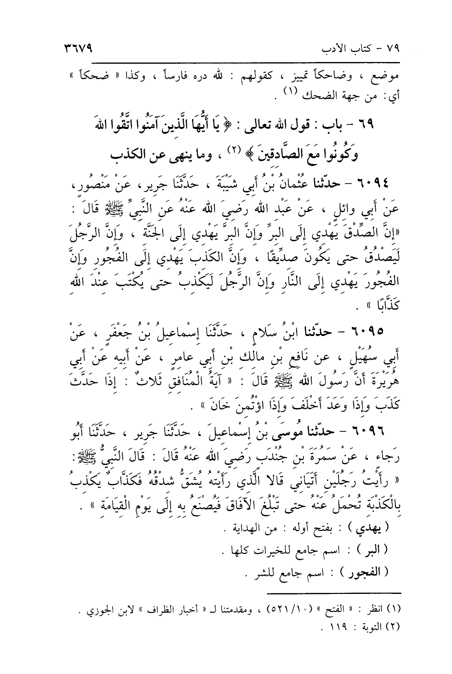 69 - بَابُ قَوْلِ اللَّهِ تَعَالَى: {يَا أَيُّهَا الَّذِينَ آمَنُوا اتَّقُوا اللَّهَ وَكُونُوا مَعَ الصَّادِقِينَ} [التوبة: 119] وَمَا يُنْهَى عَنِ الكَذِبِ