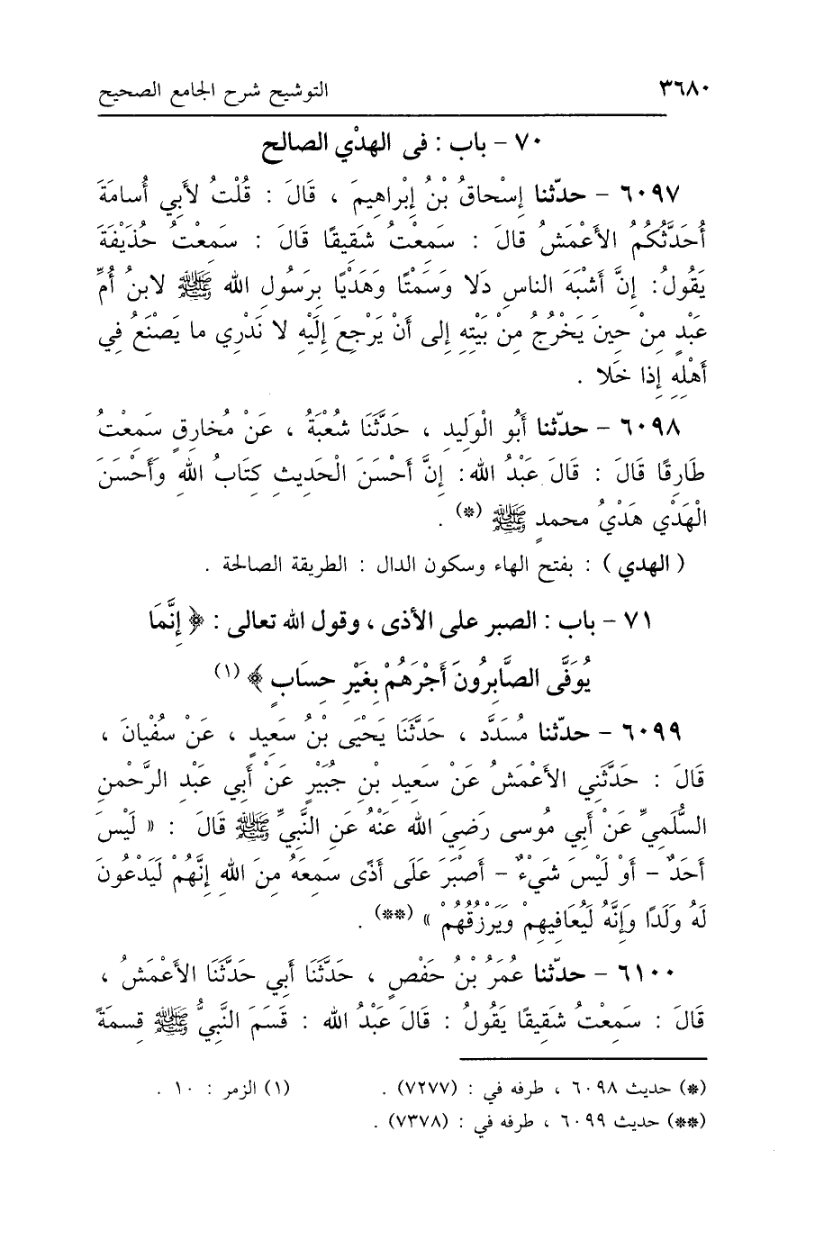 6098 - حَدَّثَنَا أَبُو الوَلِيدِ، حَدَّثَنَا شُعْبَةُ، عَنْ مُخَارِقٍ، سَمِعْتُ طَارِقًا، قَالَ: قَالَ عَبْدُ اللَّهِ: «إِنَّ أَحْسَنَ الحَدِيثِ كِتَابُ اللَّهِ، وَأَحْسَنَ الهَدْيِ هَدْيُ مُحَمَّدٍ صَلَّى اللهُ عَلَيْهِ وَسَلَّمَ».