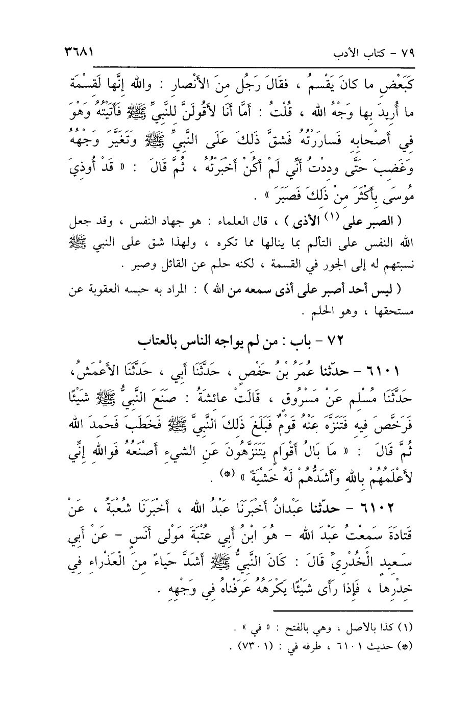 (الصبر على (1) الأذى)، قال العلماء: هو جهاد النفس، وقد جعل الله النفس على التألم بما ينالها مما تكره، ولهذا شق على النبي - صلى الله عليه وسلم - نسبتهم له إلى الجور في القسمة، لكنه حلم عن القائل وصبر.