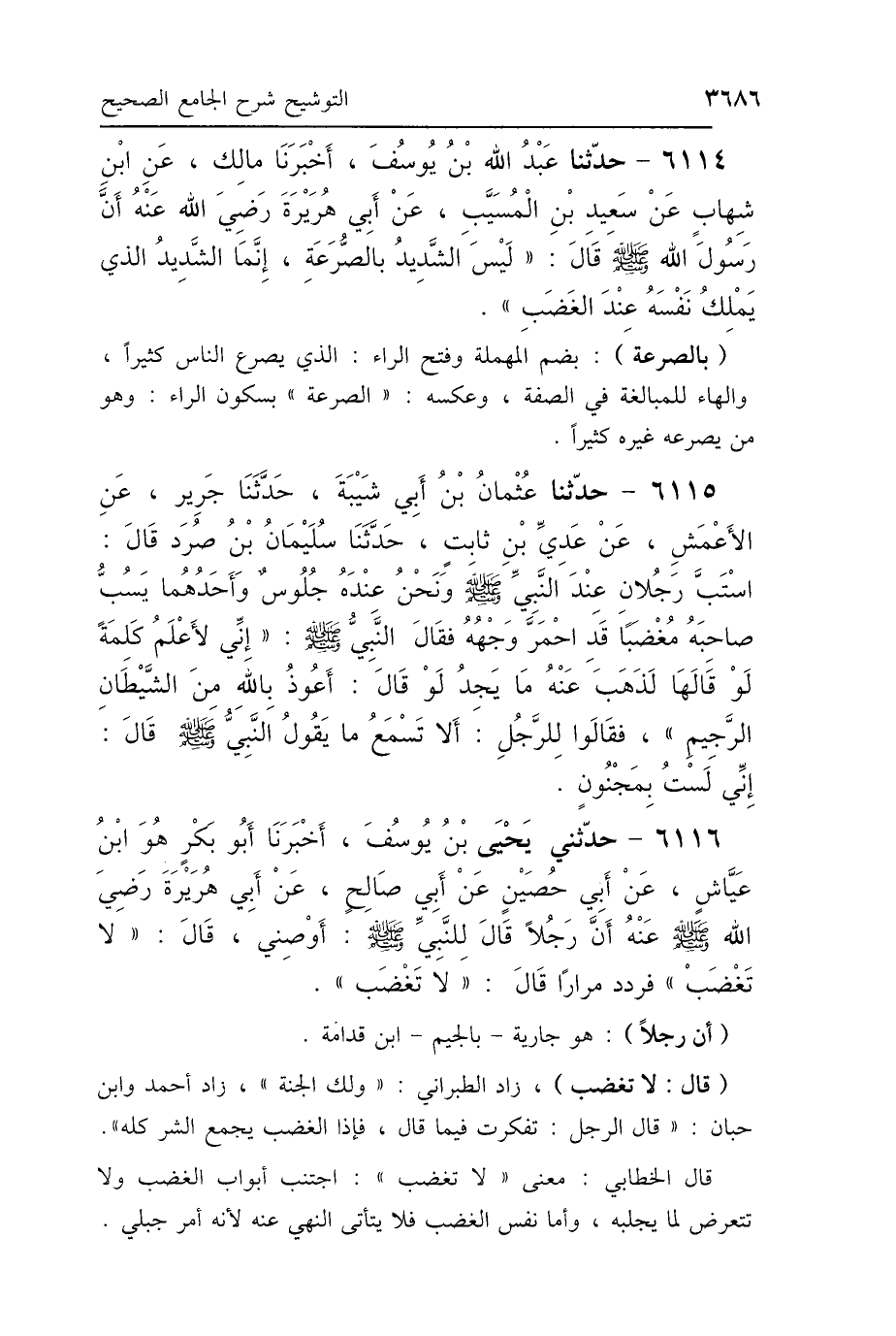 6116 - حَدَّثَنِي يَحْيَى بْنُ يُوسُفَ، أَخْبَرَنَا أَبُو بَكْرٍ هُوَ ابْنُ عَيَّاشٍ، عَنْ أَبِي حَصِينٍ، عَنْ أَبِي صَالِحٍ، عَنْ أَبِي هُرَيْرَةَ رَضِيَ اللَّهُ عَنْهُ، أَنَّ رَجُلًا قَالَ لِلنَّبِيِّ صَلَّى اللهُ عَلَيْهِ وَسَلَّمَ: أَوْصِنِي، قَالَ: «لاَ تَغْضَبْ» فَرَدَّدَ مِرَارًا، قَالَ: «لاَ تَغْضَبْ».