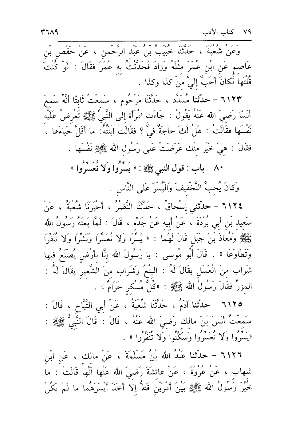 6125 - حَدَّثَنَا آدَمُ، حَدَّثَنَا شُعْبَةُ، عَنْ أَبِي التَّيَّاحِ، قَالَ: سَمِعْتُ أَنَسَ بْنَ مَالِكٍ رَضِيَ اللَّهُ عَنْهُ، قَالَ: قَالَ النَّبِيُّ صَلَّى اللهُ عَلَيْهِ وَسَلَّمَ: «يَسِّرُوا وَلاَ تُعَسِّرُوا، وَسَكِّنُوا وَلاَ تُنَفِّرُوا».