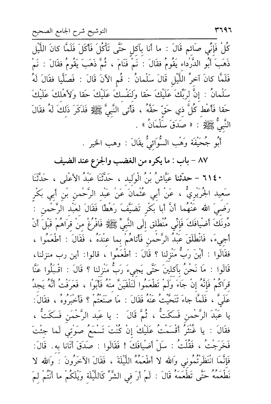 كُلْ فَإِنِّي صَائِمٌ، قَالَ: مَا أَنَا بِآكِلٍ حَتَّى تَأْكُلَ، فَأَكَلَ، فَلَمَّا كَانَ اللَّيْلُ ذَهَبَ أَبُوالدَّرْدَاءِ يَقُومُ، فَقَالَ: نَمْ، فَنَامَ، ثُمَّ ذَهَبَ يَقُومُ، فَقَالَ: نَمْ، فَلَمَّا كَانَ آخِرُ اللَّيْلِ، قَالَ سَلْمَانُ: قُمِ الآنَ، قَالَ: فَصَلَّيَا، فَقَالَ لَهُ سَلْمَانُ: إِنَّ لِرَبِّكَ عَلَيْكَ حَقًّا، وَلِنَفْسِكَ عَلَيْكَ حَقًّا، وَلِأَهْلِكَ عَلَيْكَ حَقًّا، فَأَعْطِ كُلَّ ذِي حَقٍّ حَقَّهُ، فَأَتَى النَّبِيَّ صَلَّى اللهُ عَلَيْهِ وَسَلَّمَ فَذَكَرَ ذَلِكَ لَهُ، فَقَالَ النَّبِيُّ صَلَّى اللهُ عَلَيْهِ وَسَلَّمَ: «صَدَقَ سَلْمَانُ» أَبُو جُحَيْفَةَ وَهْبٌ السُّوَائِيُّ يُقَالُ: وَهْبُ الخَيْرِ.