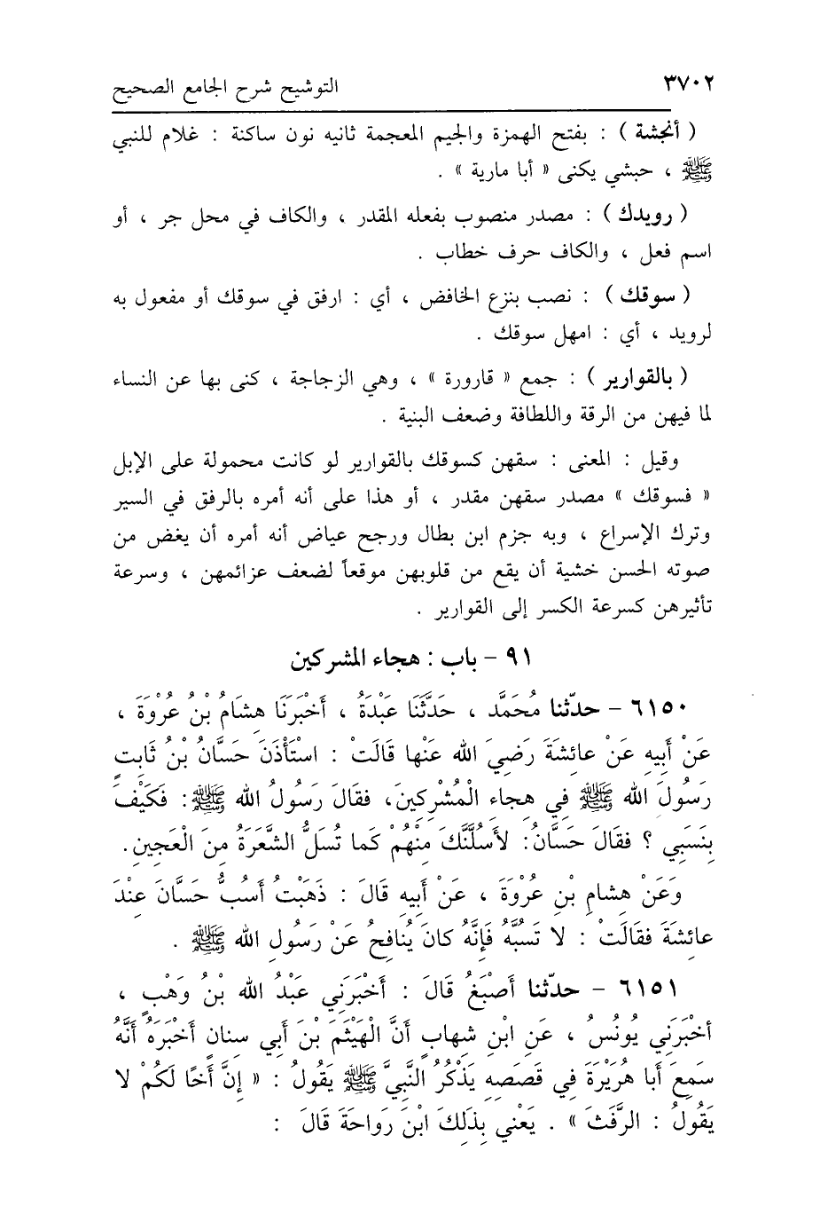 وقيل: المعنى: سقهن كسوقك بالقوارير لو كانت محمولة على الإبل "فسوقك" مصدر سقهن مقدر، أو هذا على أنه أمره بالرفق في السير وترك الإسراع، وبه جزم ابن بطال ورجح عياض أنه أمره أن يغض من صوته الحسن خشية أن يقع من قلوبهن موقعًا لضعف عزائمهن، وسرعة تأثيرهن كسرعة الكسر إلى القوارير.