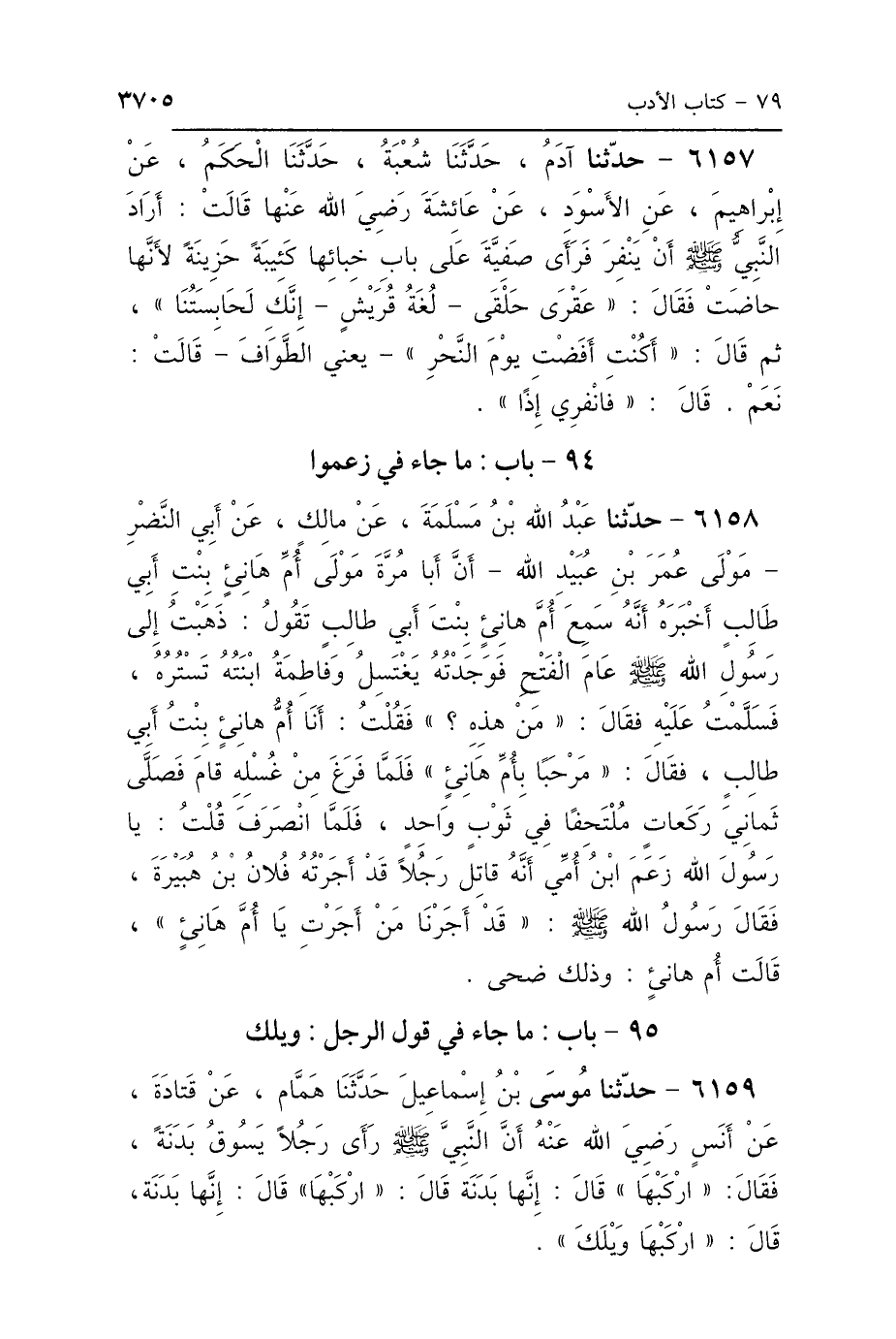 6159 - حَدَّثَنَا مُوسَى بْنُ إِسْمَاعِيلَ، حَدَّثَنَا هَمَّامٌ، عَنْ قَتَادَةَ، عَنْ أَنَسٍ رَضِيَ اللَّهُ عَنْهُ، أَنَّ النَّبِيَّ صَلَّى اللهُ عَلَيْهِ وَسَلَّمَ رَأَى رَجُلًا يَسُوقُ بَدَنَةً، فَقَالَ: «ارْكَبْهَا» قَالَ: إِنَّهَا بَدَنَةٌ، قَالَ: «ارْكَبْهَا» قَالَ: إِنَّهَا بَدَنَةٌ، قَالَ: «ارْكَبْهَا وَيْلَكَ».