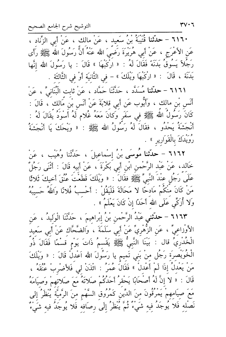6161 - حَدَّثَنَا مُسَدَّدٌ، حَدَّثَنَا حَمَّادٌ، عَنْ ثَابِتٍ البُنَانِيِّ، عَنْ أَنَسِ بْنِ مَالِكٍ، وَأَيُّوبَ، عَنْ أَبِي قِلاَبَةَ، عَنْ أَنَسِ بْنِ مَالِكٍ، قَالَ: كَانَ رَسُولُ اللَّهِ صَلَّى اللهُ عَلَيْهِ وَسَلَّمَ فِي سَفَرٍ، وَكَانَ مَعَهُ غُلاَمٌ لَهُ أَسْوَدُ يُقَالُ لَهُ أَنْجَشَةُ، يَحْدُو، فَقَالَ لَهُ رَسُولُ اللَّهِ صَلَّى اللهُ عَلَيْهِ وَسَلَّمَ: «وَيْحَكَ يَا أَنْجَشَةُ رُوَيْدَكَ بِالقَوَارِيرِ».