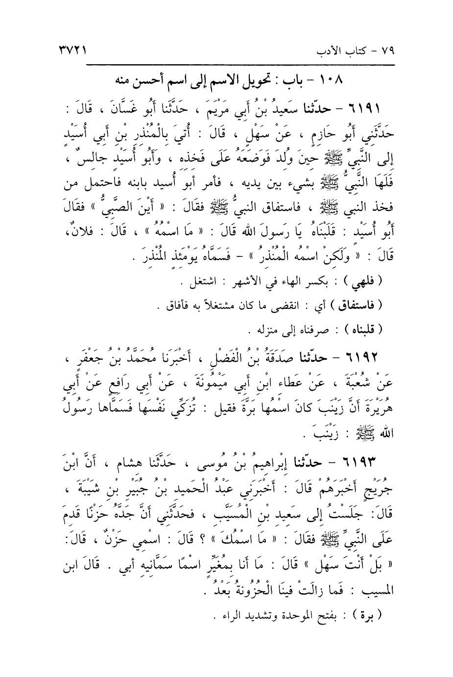 6191 - حَدَّثَنَا سَعِيدُ بْنُ أَبِي مَرْيَمَ، حَدَّثَنَا أَبُو غَسَّانَ، قَالَ: حَدَّثَنِي أَبُو حَازِمٍ، عَنْ سَهْلٍ، قَالَ: أُتِيَ بِالْمُنْذِرِ بْنِ أَبِي أُسَيْدٍ إِلَى النَّبِيِّ صَلَّى اللهُ عَلَيْهِ وَسَلَّمَ حِينَ وُلِدَ، فَوَضَعَهُ عَلَى فَخِذِهِ، وَأَبُو أُسَيْدٍ جَالِسٌ، فَلَهَا النَّبِيُّ صَلَّى اللهُ عَلَيْهِ وَسَلَّمَ بِشَيْءٍ بَيْنَ يَدَيْهِ، فَأَمَرَ أَبُو أُسَيْدٍ بِابْنِهِ، فَاحْتُمِلَ مِنْ فَخِذِ النَّبِيِّ صَلَّى اللهُ عَلَيْهِ وَسَلَّمَ، فَاسْتَفَاقَ النَّبِيُّ صَلَّى اللهُ عَلَيْهِ وَسَلَّمَ فَقَالَ: «أَيْنَ الصَّبِيُّ» فَقَالَ أَبُو أُسَيْدٍ: قَلَبْنَاهُ يَا رَسُولَ اللَّهِ، قَالَ: «مَا اسْمُهُ» قَالَ: فُلاَنٌ، قَالَ: «وَلَكِنْ أَسْمِهِ المُنْذِرَ» فَسَمَّاهُ يَوْمَئِذٍ المُنْذِرَ.