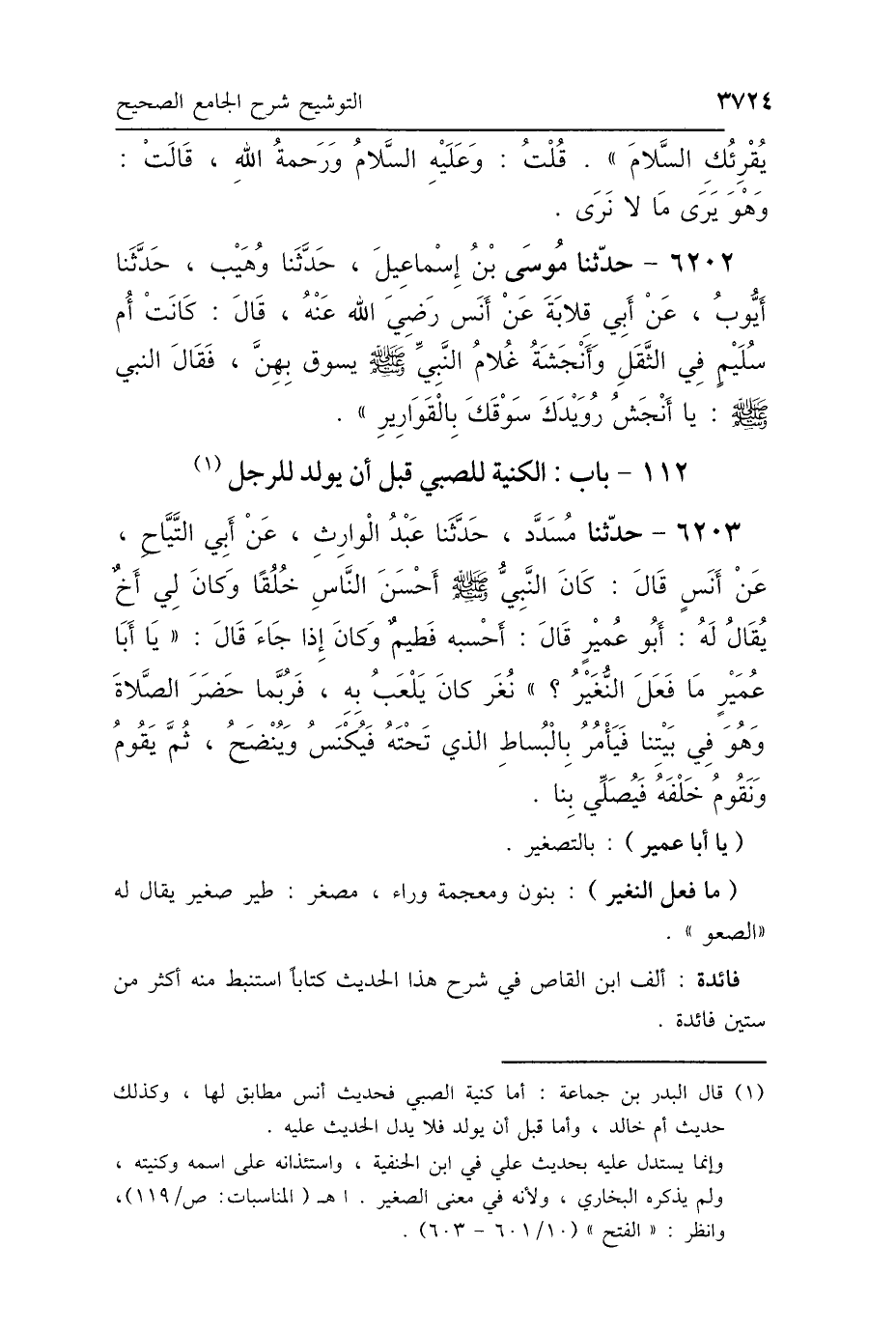 6203 - حَدَّثَنَا مُسَدَّدٌ، حَدَّثَنَا عَبْدُ الوَارِثِ، عَنْ أَبِي التَّيَّاحِ، عَنْ أَنَسٍ، قَالَ: كَانَ النَّبِيُّ صَلَّى اللهُ عَلَيْهِ وَسَلَّمَ أَحْسَنَ النَّاسِ خُلُقًا، وَكَانَ لِي أَخٌ يُقَالُ لَهُ أَبُو عُمَيْرٍ - قَالَ: أَحْسِبُهُ - فَطِيمًا، وَكَانَ إِذَا جَاءَ قَالَ: «يَا أَبَا عُمَيْرٍ، مَا فَعَلَ النُّغَيْرُ» نُغَرٌ كَانَ يَلْعَبُ بِهِ، فَرُبَّمَا حَضَرَ الصَّلاَةَ وَهُوَ فِي بَيْتِنَا، فَيَأْمُرُ بِالْبِسَاطِ الَّذِي تَحْتَهُ فَيُكْنَسُ وَيُنْضَحُ، ثُمَّ يَقُومُ وَنَقُومُ خَلْفَهُ فَيُصَلِّي بِنَا.