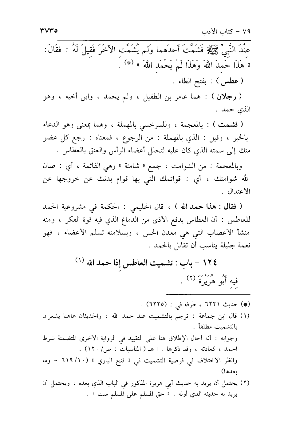 (فشمت): بالمعجمة، وللسرخسي بالمهملة، وهما بمعنى وهو الدعاء بالخير، وقيل: الذي بالمهملة: من الرجوع، فمعناه: رجع كل عضو منك إلى سمته الذي كان عليه لتحلل أعضاء الرأس والعنق بالعطاس.