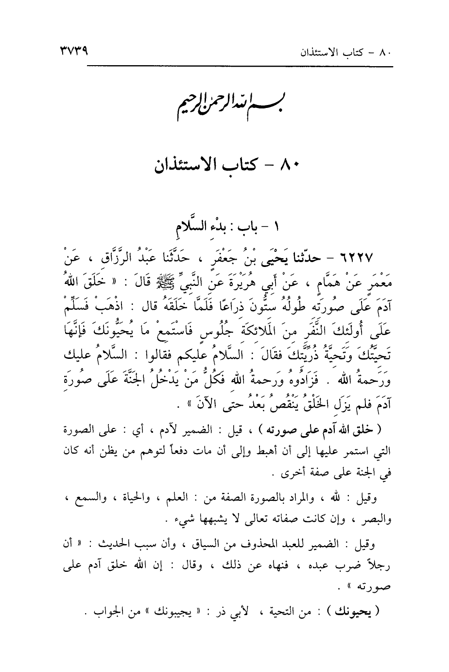 6227 - حَدَّثَنَا يَحْيَى بْنُ جَعْفَرٍ، حَدَّثَنَا عَبْدُ الرَّزَّاقِ، عَنْ مَعْمَرٍ، عَنْ هَمَّامٍ، عَنْ أَبِي هُرَيْرَةَ، عَنِ النَّبِيِّ صَلَّى اللهُ عَلَيْهِ وَسَلَّمَ قَالَ: "خَلَقَ اللَّهُ آدَمَ عَلَى صُورَتِهِ، طُولُهُ سِتُّونَ ذِرَاعًا، فَلَمَّا خَلَقَهُ قَالَ: اذْهَبْ فَسَلِّمْ عَلَى أُولَئِكَ، النَّفَرِ مِنَ المَلاَئِكَةِ، جُلُوسٌ، فَاسْتَمِعْ مَا يُحَيُّونَكَ، فَإِنَّهَا تَحِيَّتُكَ وَتَحِيَّةُ ذُرِّيَّتِكَ، فَقَالَ: السَّلاَمُ عَلَيْكُمْ، فَقَالُوا: السَّلاَمُ عَلَيْكَ وَرَحْمَةُ اللَّهِ، فَزَادُوهُ: وَرَحْمَةُ اللَّهِ، فَكُلُّ مَنْ يَدْخُلُ الجَنَّةَ عَلَى صُورَةِ آدَمَ، فَلَمْ يَزَلِ الخَلْقُ يَنْقُصُ بَعْدُ حَتَّى الآنَ".