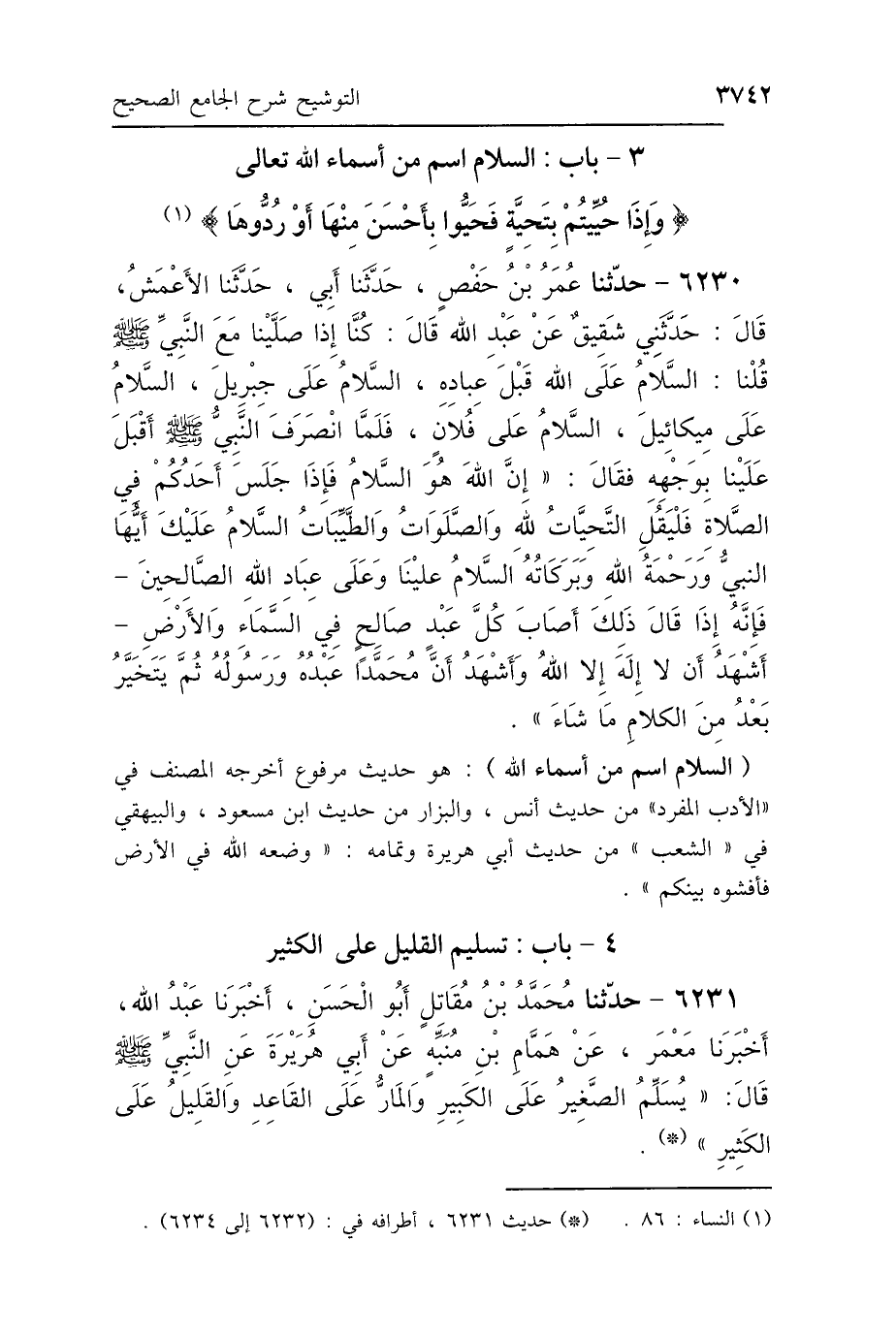 3 - بَابٌ: السَّلاَمُ اسْمٌ مِنْ أَسْمَاءِ اللَّهِ تَعَالَى {وَإِذَا حُيِّيتُمْ بِتَحِيَّةٍ فَحَيُّوا بِأَحْسَنَ مِنْهَا أَوْ رُدُّوهَا} [النساء: 86]