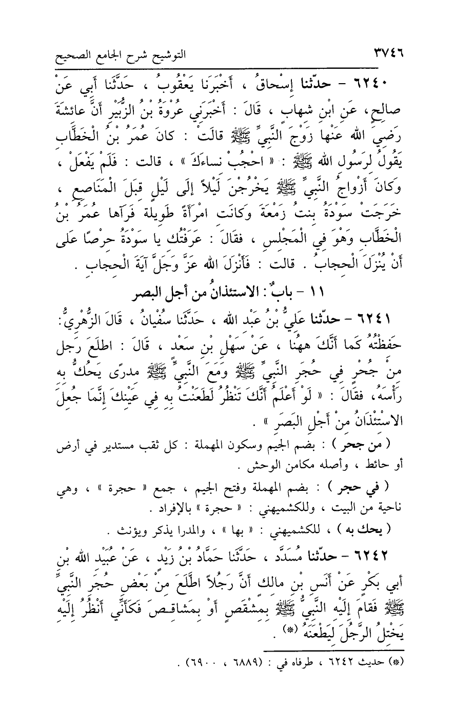 6241 - حَدَّثَنَا عَلِيُّ بْنُ عَبْدِ اللَّهِ، حَدَّثَنَا سُفْيَانُ، قَالَ: الزُّهْرِيُّ، - حَفِظْتُهُ كَمَا أَنَّكَ هَا هُنَا - عَنْ سَهْلِ بْنِ سَعْدٍ، قَالَ: اطَّلَعَ رَجُلٌ مِنْ جُحْرٍ فِي حُجَرِ النَّبِيِّ صَلَّى اللهُ عَلَيْهِ وَسَلَّمَ، وَمَعَ النَّبِيِّ صَلَّى اللهُ عَلَيْهِ وَسَلَّمَ مِدْرًى يَحُكُّ بِهِ رَأْسَهُ، فَقَالَ: «لَوْ أَعْلَمُ أَنَّكَ تَنْظُرُ، لَطَعَنْتُ بِهِ فِي عَيْنِكَ، إِنَّمَا جُعِلَ الِاسْتِئْذَانُ مِنْ أَجْلِ البَصَرِ».