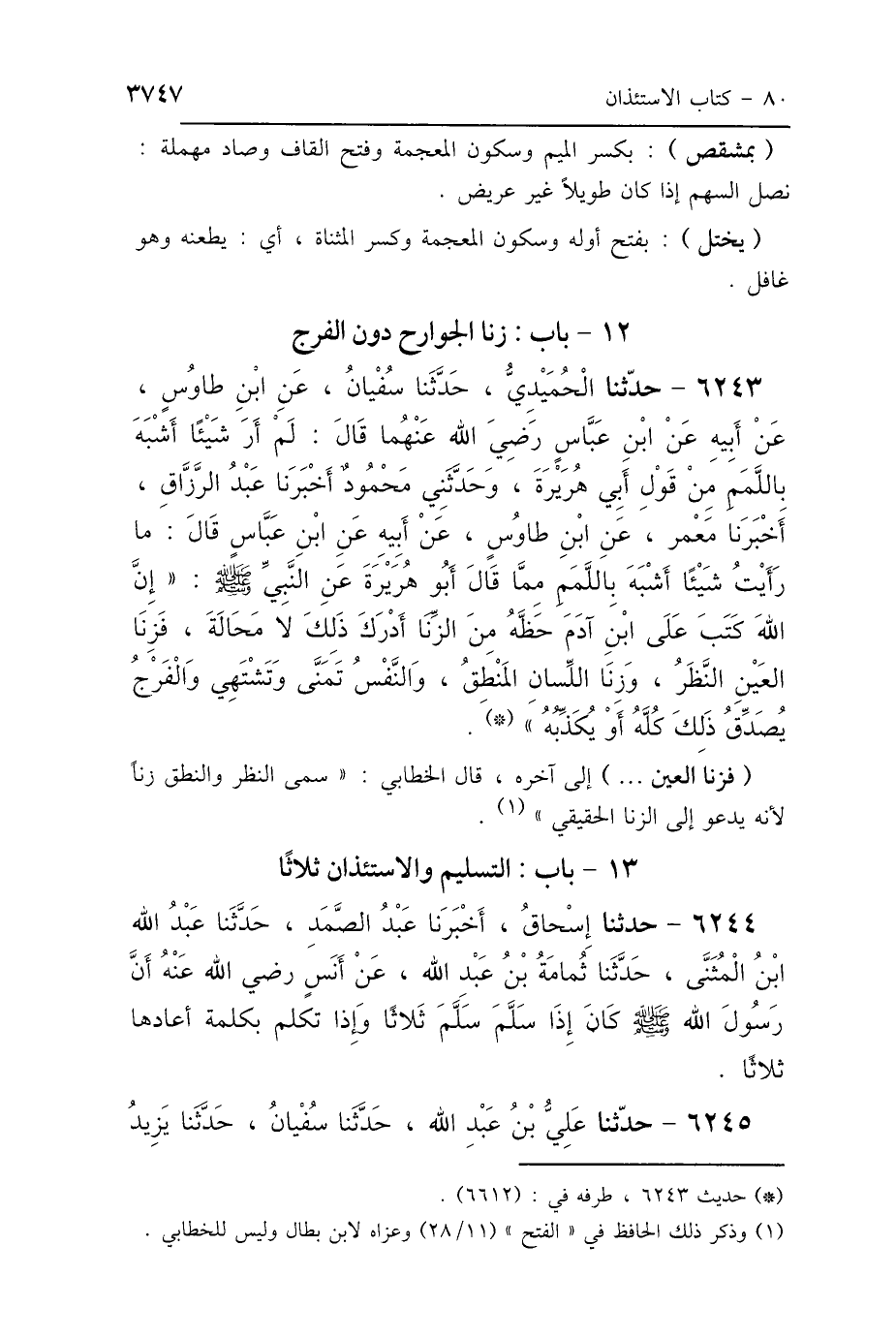 6243 - حَدَّثَنَا الحُمَيْدِيُّ، حَدَّثَنَا سُفْيَانُ، عَنِ ابْنِ طَاوُسٍ، عَنْ أَبِيهِ، عَنِ ابْنِ عَبَّاسٍ رَضِيَ اللَّهُ عَنْهُمَا، قَالَ: لَمْ أَرَ شَيْئًا أَشْبَهَ بِاللَّمَمِ مِنْ قَوْلِ أَبِي هُرَيْرَةَ، ح حَدَّثَنِي مَحْمُودٌ، أَخْبَرَنَا عَبْدُ الرَّزَّاقِ، أَخْبَرَنَا مَعْمَرٌ، عَنْ ابْنِ طَاوُسٍ، عَنْ أَبِيهِ، عَنْ ابْنِ عَبَّاسٍ، قَالَ: مَا رَأَيْتُ شَيْئًا أَشْبَهَ بِاللَّمَمِ مِمَّا قَالَ أَبُو هُرَيْرَةَ، عَنِ النَّبِيِّ صَلَّى اللهُ عَلَيْهِ وَسَلَّمَ: «إِنَّ اللَّهَ كَتَبَ عَلَى ابْنِ آدَمَ حَظَّهُ مِنَ الزِّنَا، أَدْرَكَ ذَلِكَ لاَ مَحَالَةَ، فَزِنَا العَيْنِ النَّظَرُ، وَزِنَا اللِّسَانِ المَنْطِقُ، وَالنَّفْسُ تَمَنَّى وَتَشْتَهِي، وَالفَرْجُ يُصَدِّقُ ذَلِكَ كُلَّهُ وَيُكَذِّبُهُ».