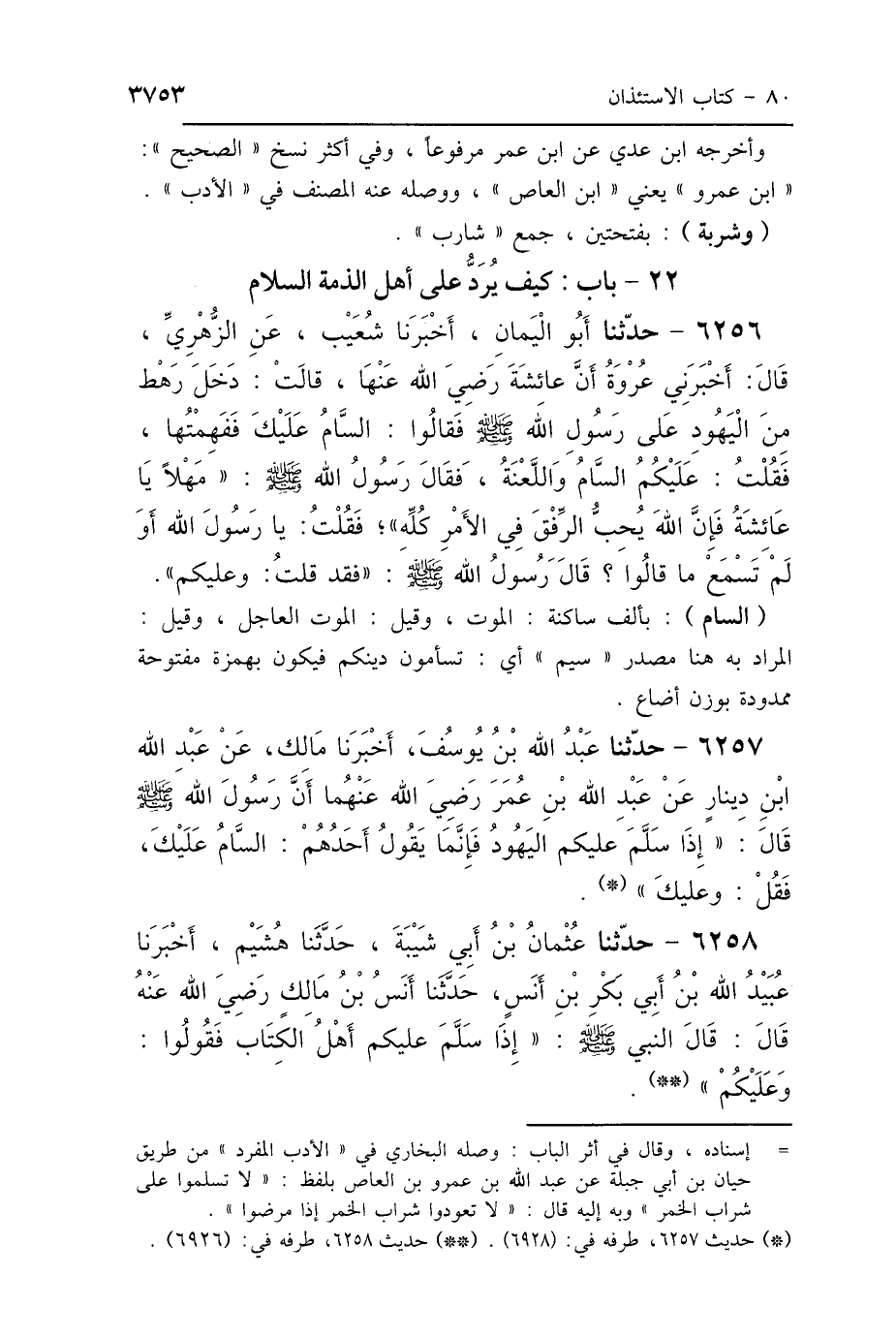 6258 - حَدَّثَنَا عُثْمَانُ بْنُ أَبِي شَيْبَةَ، حَدَّثَنَا هُشَيْمٌ، أَخْبَرَنَا عُبَيْدُ اللَّهِ بْنُ أَبِي بَكْرِ بْنِ أَنَسٍ، حَدَّثَنَا أَنَسُ بْنُ مَالِكٍ رَضِيَ اللَّهُ عَنْهُ، قَالَ: قَالَ النَّبِيُّ صَلَّى اللهُ عَلَيْهِ وَسَلَّمَ: "إِذَا سَلَّمَ عَلَيْكُمْ أَهْلُ الكِتَابِ فَقُولُوا: وَعَلَيْكُمْ".