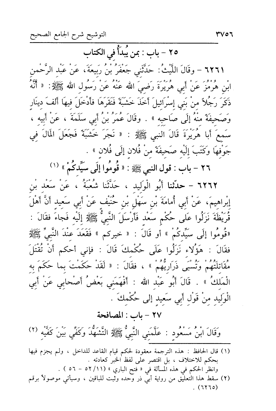 6261 - وَقَالَ اللَّيْثُ: حَدَّثَنِي جَعْفَرُ بْنُ رَبِيعَةَ، عَنْ عَبْدِ الرَّحْمَنِ بْنِ هُرْمُزَ، عَنْ أَبِي هُرَيْرَةَ رَضِيَ اللَّهُ عَنْهُ، عَنْ رَسُولِ اللَّهِ صَلَّى اللهُ عَلَيْهِ وَسَلَّمَ: «أَنَّهُ ذَكَرَ رَجُلًا مِنْ بَنِي إِسْرَائِيلَ، أَخَذَ خَشَبَةً فَنَقَرَهَا، فَأَدْخَلَ فِيهَا أَلْفَ دِينَارٍ، وَصَحِيفَةً مِنْهُ إِلَى صَاحِبِهِ»، وَقَالَ عُمَرُ بْنُ أَبِي سَلَمَةَ، عَنْ أَبِيهِ، سَمِعَ أَبَا هُرَيْرَةَ: قَالَ النَّبِيُّ صَلَّى اللهُ عَلَيْهِ وَسَلَّمَ: "نَجَرَ خَشَبَةً، فَجَعَلَ المَالَ فِي جَوْفِهَا، وَكَتَبَ إِلَيْهِ صَحِيفَةً: مِنْ فُلاَنٍ إِلَى فُلاَنٍ".