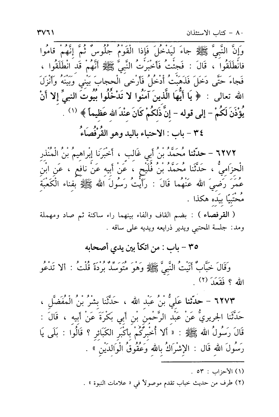 وَإِنَّ النَّبِيَّ صَلَّى اللهُ عَلَيْهِ وَسَلَّمَ جَاءَ لِيَدْخُلَ فَإِذَا القَوْمُ جُلُوسٌ، ثُمَّ إِنَّهُمْ قَامُوا فَانْطَلَقُوا» قَالَ: «فَجِئْتُ فَأَخْبَرْتُ النَّبِيَّ صَلَّى اللهُ عَلَيْهِ وَسَلَّمَ أَنَّهُمْ قَدِ انْطَلَقُوا، فَجَاءَ حَتَّى دَخَلَ، فَذَهَبْتُ أَدْخُلُ فَأَرْخَى الحِجَابَ بَيْنِي وَبَيْنَهُ» وَأَنْزَلَ اللَّهُ تَعَالَى: {يَا أَيُّهَا الَّذِينَ آمَنُوا لاَ تَدْخُلُوا بُيُوتَ النَّبِيِّ إِلَّا أَنْ يُؤْذَنَ لَكُمْ} [الأحزاب: 53]- إِلَى قَوْلِهِ - {إِنَّ ذَلِكُمْ كَانَ عِنْدَ اللَّهِ عَظِيمًا} [الأحزاب: 53].