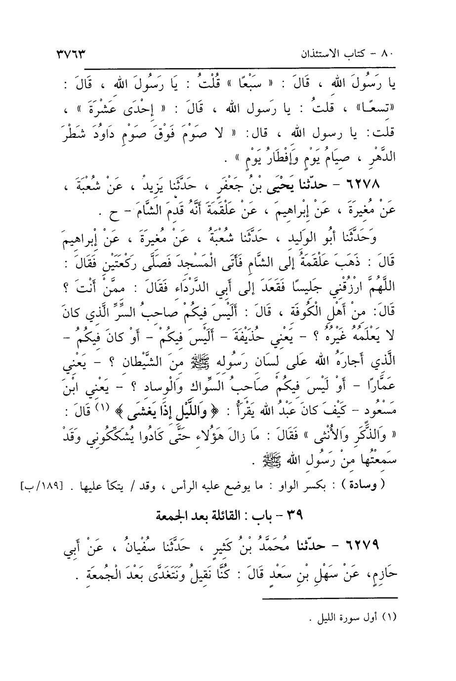 6278 - حَدَّثَنَا يَحْيَى بْنُ جَعْفَرٍ، حَدَّثَنَا يَزِيدُ، عَنْ شُعْبَةَ، عَنْ مُغِيرَةَ، عَنْ إِبْرَاهِيمَ، عَنْ عَلْقَمَةَ - أَنَّهُ قَدِمَ الشَّأْمَ - ح وَحَدَّثَنَا أَبُو الوَلِيدِ، حَدَّثَنَا شُعْبَةُ، عَنْ مُغِيرَةَ، عَنْ إِبْرَاهِيمَ، قَالَ: ذَهَبَ عَلْقَمَةُ، إِلَى الشَّأْمِ، فَأَتَى المَسْجِدَ فَصَلَّى رَكْعَتَيْنِ، فَقَالَ: اللَّهُمَّ ارْزُقْنِي جَلِيسًا، فَقَعَدَ إِلَى أَبِي الدَّرْدَاءِ، فَقَالَ: مِمَّنْ أَنْتَ؟ قَالَ: مِنْ أَهْلِ الكُوفَةِ؟ قَالَ: " أَلَيْسَ فِيكُمْ صَاحِبُ السِّرِّ الَّذِي كَانَ لاَ يَعْلَمُهُ غَيْرُهُ - يَعْنِي حُذَيْفَةَ - أَلَيْسَ فِيكُمْ - أَوْ كَانَ فِيكُمْ - الَّذِي أَجَارَهُ اللَّهُ عَلَى لِسَانِ رَسُولِهِ صَلَّى اللهُ عَلَيْهِ وَسَلَّمَ مِنَ الشَّيْطَانِ - يَعْنِي عَمَّارًا - أَوَلَيْسَ فِيكُمْ صَاحِبُ السِّوَاكِ وَالوِسَادِ - يَعْنِي ابْنَ مَسْعُودٍ - كَيْفَ كَانَ عَبْدُ اللَّهِ يَقْرَأُ: {وَاللَّيْلِ إِذَا يَغْشَى} [الليل: 1] قَالَ: وَالذَّكَرِ وَالأُنْثَى " فَقَالَ: مَا زَالَ هَؤُلاَءِ حَتَّى كَادُوا يُشَكِّكُونِي، وَقَدْ سَمِعْتُهَا مِنْ رَسُولِ اللَّهِ صَلَّى اللهُ عَلَيْهِ وَسَلَّمَ.