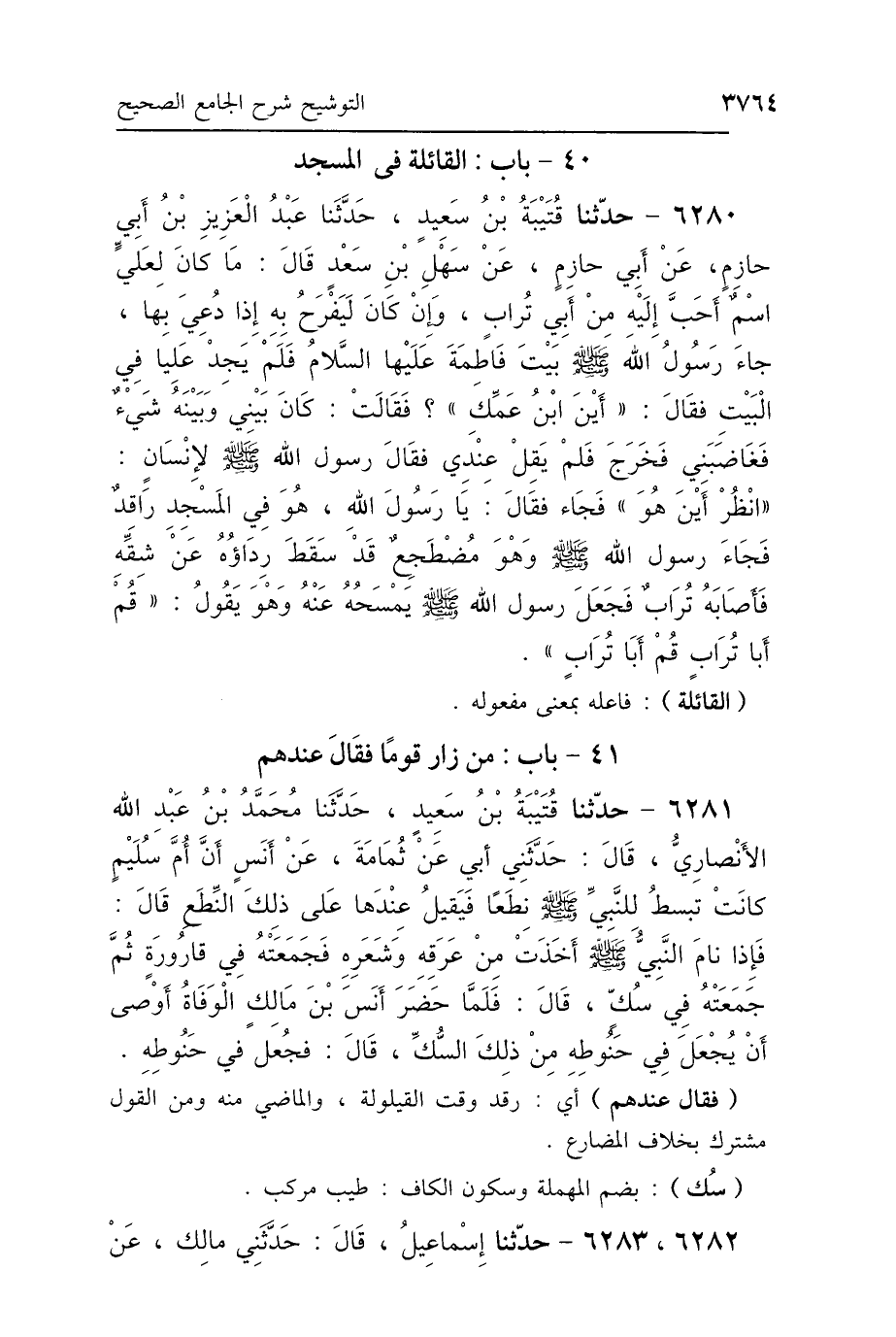 6280 - حَدَّثَنَا قُتَيْبَةُ بْنُ سَعِيدٍ، حَدَّثَنَا عَبْدُ العَزِيزِ بْنُ أَبِي حَازِمٍ، عَنْ أَبِي حَازِمٍ، عَنْ سَهْلِ بْنِ سَعْدٍ، قَالَ: مَا كَانَ لِعَلِيٍّ اسْمٌ أَحَبَّ إِلَيْهِ مِنْ أَبِي تُرَابٍ، وَإِنْ كَانَ لَيَفْرَحُ بِهِ إِذَا دُعِيَ بِهَا، جَاءَ رَسُولُ اللَّهِ صَلَّى اللهُ عَلَيْهِ وَسَلَّمَ بَيْتَ فَاطِمَةَ عَلَيْهَا السَّلاَمُ، فَلَمْ يَجِدْ عَلِيًّا فِي البَيْتِ، فَقَالَ: «أَيْنَ ابْنُ عَمِّكِ» فَقَالَتْ: كَانَ بَيْنِي وَبَيْنَهُ شَيْءٌ، فَغَاضَبَنِي فَخَرَجَ فَلَمْ يَقِلْ عِنْدِي، فَقَالَ رَسُولُ اللَّهِ صَلَّى اللهُ عَلَيْهِ وَسَلَّمَ لِإِنْسَانٍ: «انْظُرْ أَيْنَ هُوَ» فَجَاءَ فَقَالَ: يَا رَسُولَ اللَّهِ هُوَ فِي المَسْجِدِ رَاقِدٌ، فَجَاءَ رَسُولُ اللَّهِ صَلَّى اللهُ عَلَيْهِ وَسَلَّمَ وَهُوَ مُضْطَجِعٌ، قَدْ سَقَطَ رِدَاؤُهُ عَنْ شِقِّهِ فَأَصَابَهُ تُرَابٌ، فَجَعَلَ رَسُولُ اللَّهِ صَلَّى اللهُ عَلَيْهِ وَسَلَّمَ يَمْسَحُهُ عَنْهُ وَهُوَ يَقُولُ: «قُمْ أَبَا تُرَابٍ، قُمْ أَبَا تُرَابٍ».