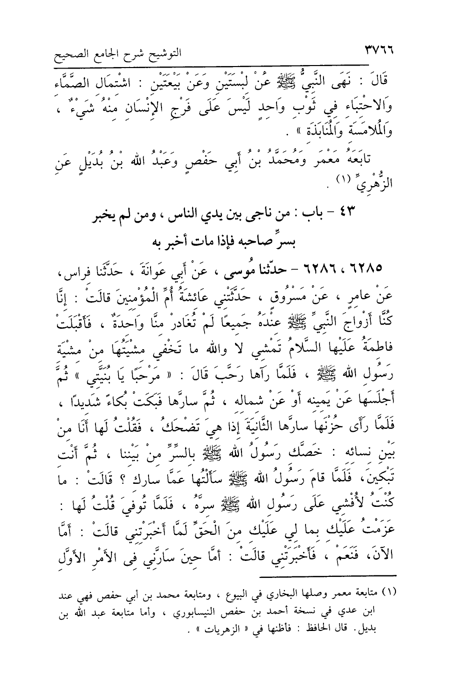 6285، 6286 - حَدَّثَنَا مُوسَى، عَنْ أَبِي عَوَانَةَ، حَدَّثَنَا فِرَاسٌ، عَنْ عَامِرٍ، عَنْ مَسْرُوقٍ، حَدَّثَتْنِي عَائِشَةُ أُمُّ المُؤْمِنِيِنَ، قَالَتْ: إِنَّا كُنَّا أَزْوَاجَ النَّبِيِّ صَلَّى اللهُ عَلَيْهِ وَسَلَّمَ عِنْدَهُ جَمِيعًا، لَمْ تُغَادَرْ مِنَّا وَاحِدَةٌ، فَأَقْبَلَتْ فَاطِمَةُ عَلَيْهَا السَّلاَمُ تَمْشِي، لاَ وَاللَّهِ مَا تَخْفَى مِشْيَتُهَا مِنْ مِشْيَةِ رَسُولِ اللَّهِ صَلَّى اللهُ عَلَيْهِ وَسَلَّمَ، فَلَمَّا رَآهَا رَحَّبَ قَالَ: «مَرْحَبًا بِابْنَتِي» ثُمَّ أَجْلَسَهَا عَنْ يَمِينِهِ أَوْ عَنْ شِمَالِهِ، ثُمَّ سَارَّهَا، فَبَكَتْ بُكَاءً شَدِيدًا، فَلَمَّا رَأَى حُزْنَهَا سَارَّهَا الثَّانِيَةَ، فَإِذَا هِيَ تَضْحَكُ، فَقُلْتُ لَهَا أَنَا مِنْ بَيْنِ نِسَائِهِ: خَصَّكِ رَسُولُ اللَّهِ صَلَّى اللهُ عَلَيْهِ وَسَلَّمَ بِالسِّرِّ مِنْ بَيْنِنَا، ثُمَّ أَنْتِ تَبْكِينَ، فَلَمَّا قَامَ رَسُولُ اللَّهِ صَلَّى اللهُ عَلَيْهِ وَسَلَّمَ سَأَلْتُهَا: عَمَّا سَارَّكِ؟ قَالَتْ: مَا كُنْتُ لِأُفْشِيَ عَلَى رَسُولِ اللَّهِ صَلَّى اللهُ عَلَيْهِ وَسَلَّمَ سِرَّهُ، فَلَمَّا تُوُفِّيَ، قُلْتُ لَهَا: عَزَمْتُ عَلَيْكِ بِمَا لِي عَلَيْكِ مِنَ الحَقِّ لَمَّا أَخْبَرْتِنِي، قَالَتْ: أَمَّا الآنَ فَنَعَمْ، فَأَخْبَرَتْنِي، قَالَتْ: أَمَّا حِينَ سَارَّنِي فِي الأَمْرِ الأَوَّلِ،