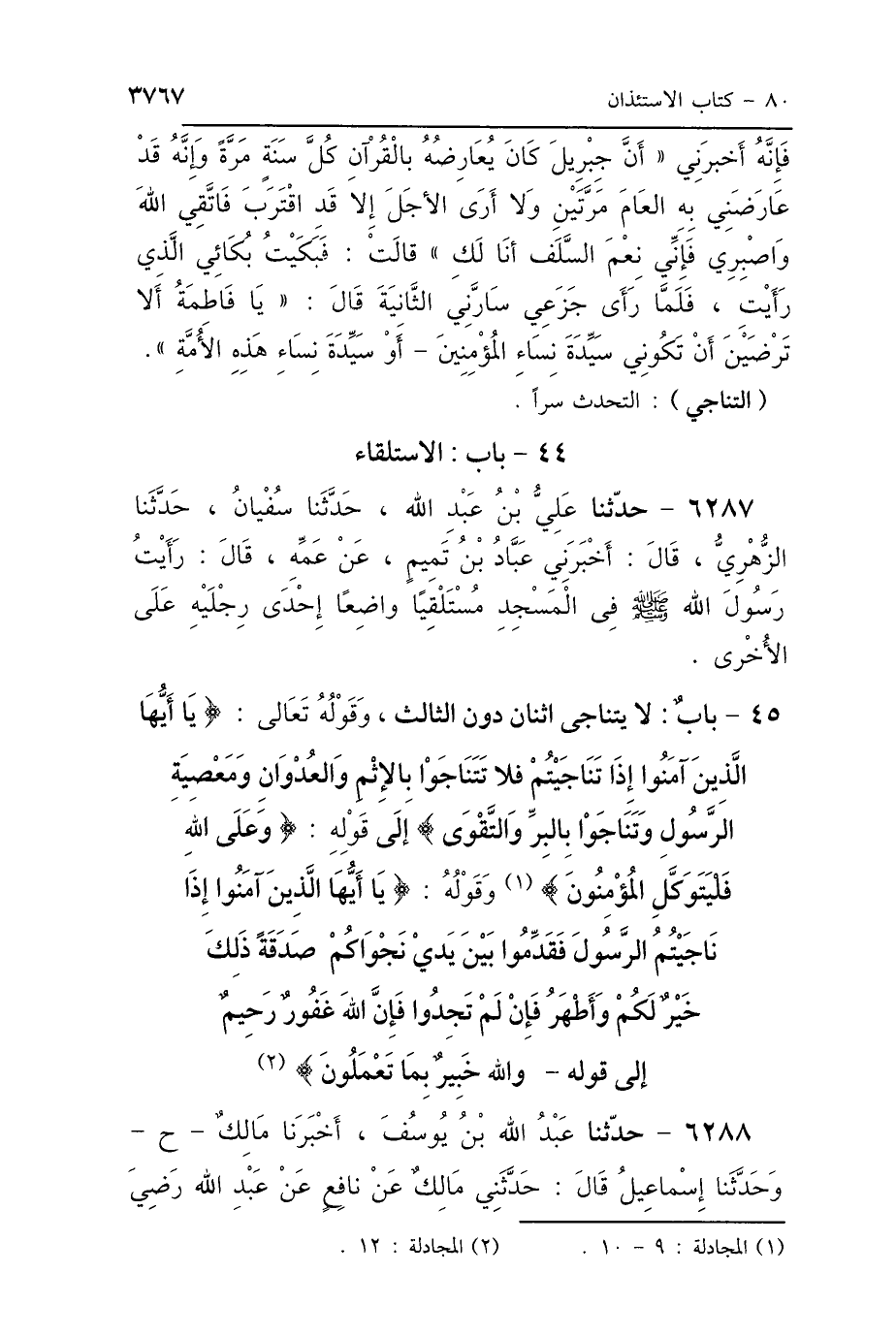 45 - بَابُ لاَ يَتَنَاجَى اثْنَانِ دُونَ الثَّالِثِ، وَقَوْلُهُ تَعَالَى: {يَا أَيُّهَا الَّذِينَ آمَنُوا إِذَا تَنَاجَيْتُمْ فَلاَ تَتَنَاجَوْا بِالإِثْمِ وَالعُدْوَانِ، وَمَعْصِيَةِ الرَّسُولِ وَتَنَاجَوْا بِالْبِرِّ وَالتَّقْوَى} - إِلَى قَوْلِهِ - {وَعَلَى اللَّهِ فَلْيَتَوَكَّلِ المُؤْمِنُونَ} [آل عمران: 122] وَقَوْلُهُ: {يَا أَيُّهَا الَّذِينَ آمَنُوا إِذَا نَاجَيْتُمُ الرَّسُولَ فَقَدِّمُوا بَيْنَ يَدَيْ نَجْوَاكُمْ صَدَقَةً، ذَلِكَ خَيْرٌ لَكُمْ وَأَطْهَرُ، فَإِنْ لَمْ تَجِدُوا فَإِنَّ اللَّهَ غَفُورٌ رَحِيمٌ} [المجادلة: 12]- إِلَى قَوْلِهِ - {وَاللَّهُ خَبِيرٌ بِمَا تَعْمَلُونَ} [آل عمران: 153]