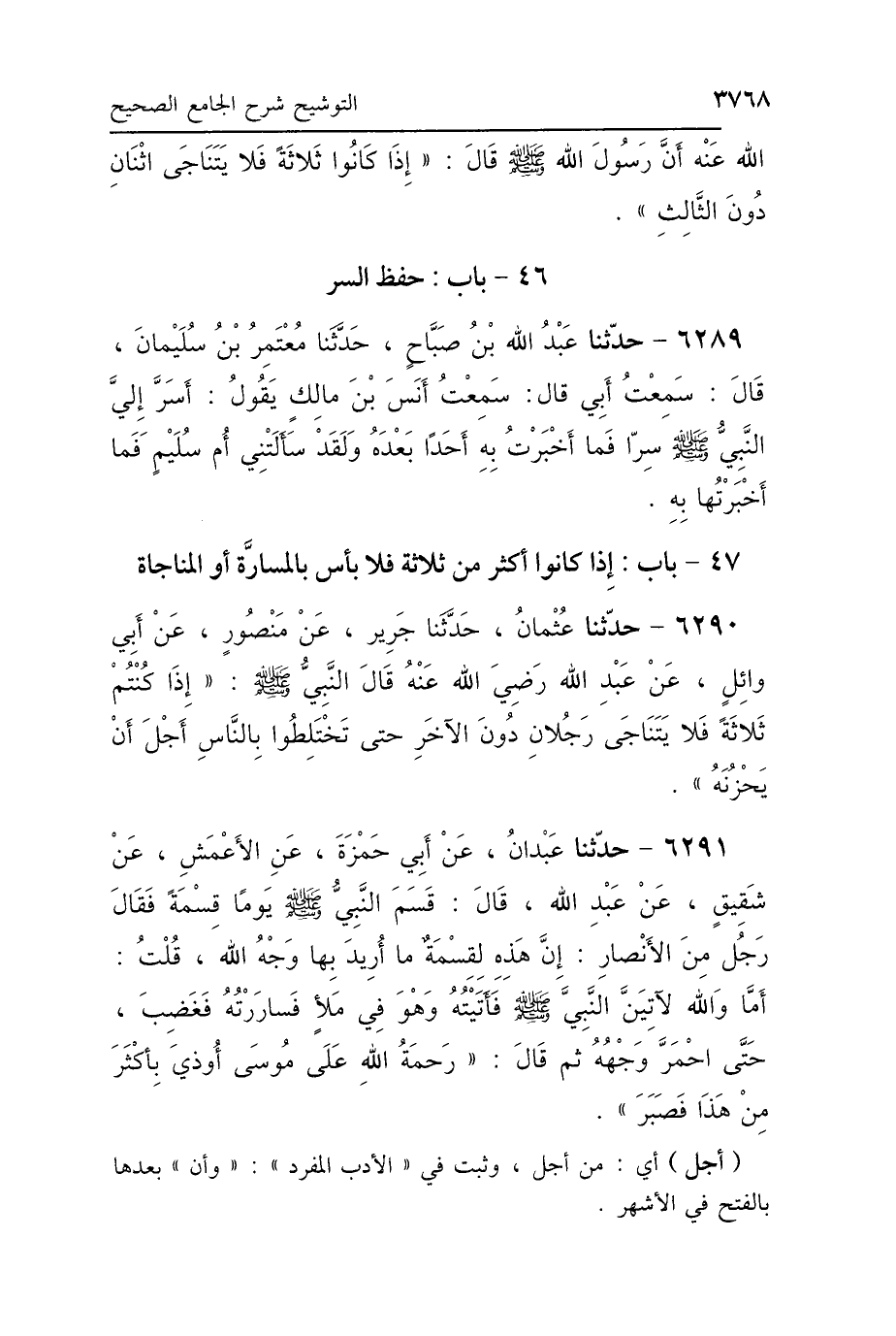 6290 - حَدَّثَنَا عُثْمَانُ، حَدَّثَنَا جَرِيرٌ، عَنْ مَنْصُورٍ، عَنْ أَبِي وَائِلٍ، عَنْ عَبْدِ اللَّهِ رَضِيَ اللَّهُ عَنْهُ: قَالَ النَّبِيُّ صَلَّى اللهُ عَلَيْهِ وَسَلَّمَ: «إِذَا كُنْتُمْ ثَلاَثَةً، فَلاَ يَتَنَاجَى رَجُلاَنِ دُونَ الآخَرِ حَتَّى تَخْتَلِطُوا بِالنَّاسِ، أَجْلَ أَنْ يُحْزِنَهُ».