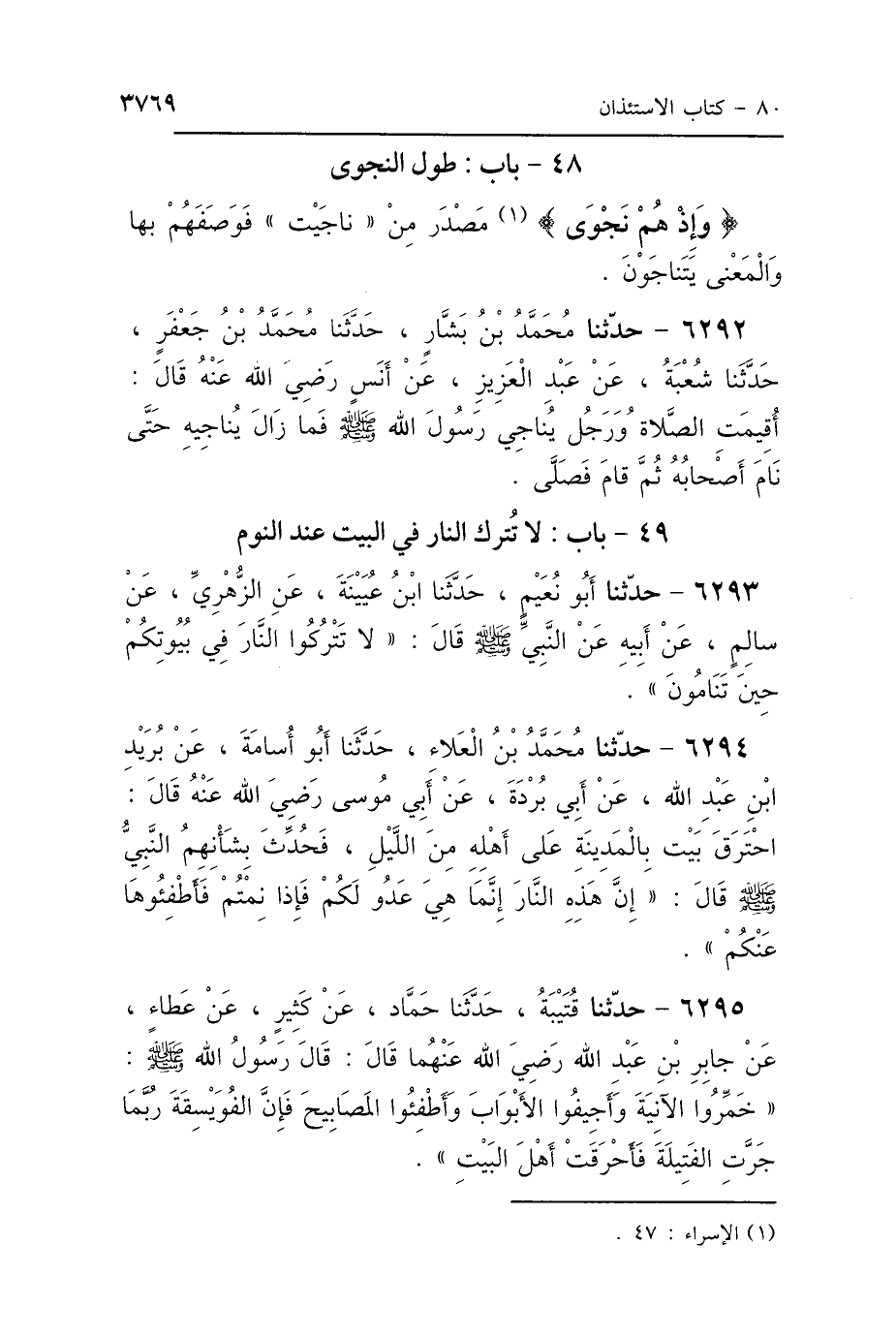 6293 - حَدَّثَنَا أَبُو نُعَيْمٍ، حَدَّثَنَا ابْنُ عُيَيْنَةَ، عَنِ الزُّهْرِيِّ، عَنْ سَالِمٍ، عَنْ أَبِيهِ، عَنِ النَّبِيِّ صَلَّى اللهُ عَلَيْهِ وَسَلَّمَ قَالَ: «لاَ تَتْرُكُوا النَّارَ فِي بُيُوتِكُمْ حِينَ تَنَامُونَ».
